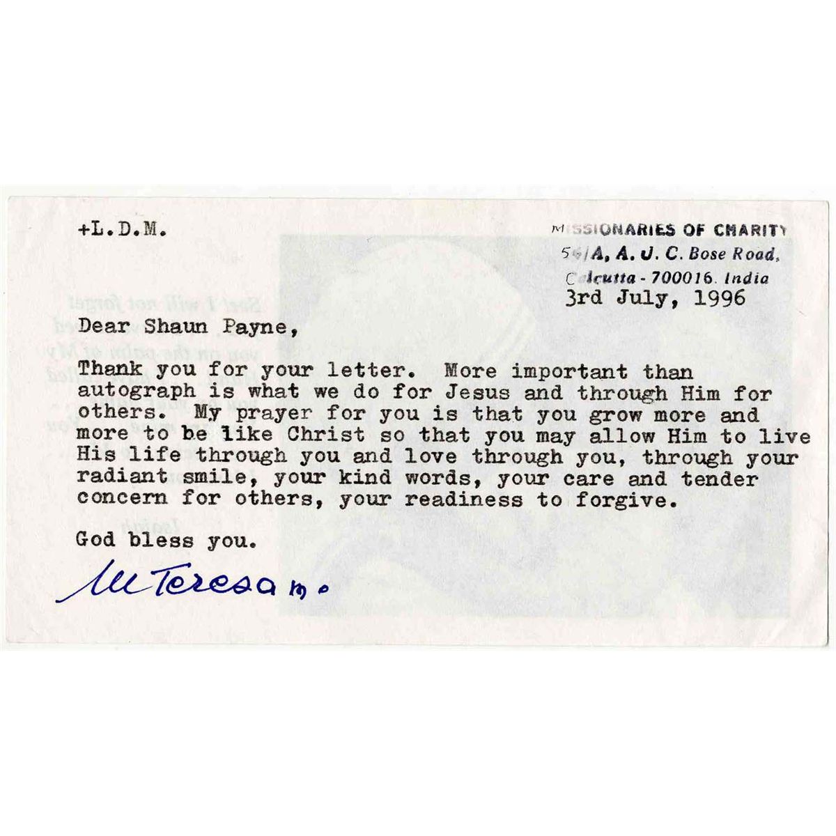 Mother Teresa typed letter signed, dated 3 July 1996. Letter is addressed to Shaun Payne and reads in part, ''…More important than autograph is what we do for Jesus and through Him for others. My prayer for you is that you grow more and more like Christ so that you may allow Him to live His life through you and love through you, through your radiant smile, your kind words, your care and tender concern for others, your readiness to forgive. God bless you / M. Teresa''. Letter measures 6.5'' x 3.5'' and is in near fine condition.