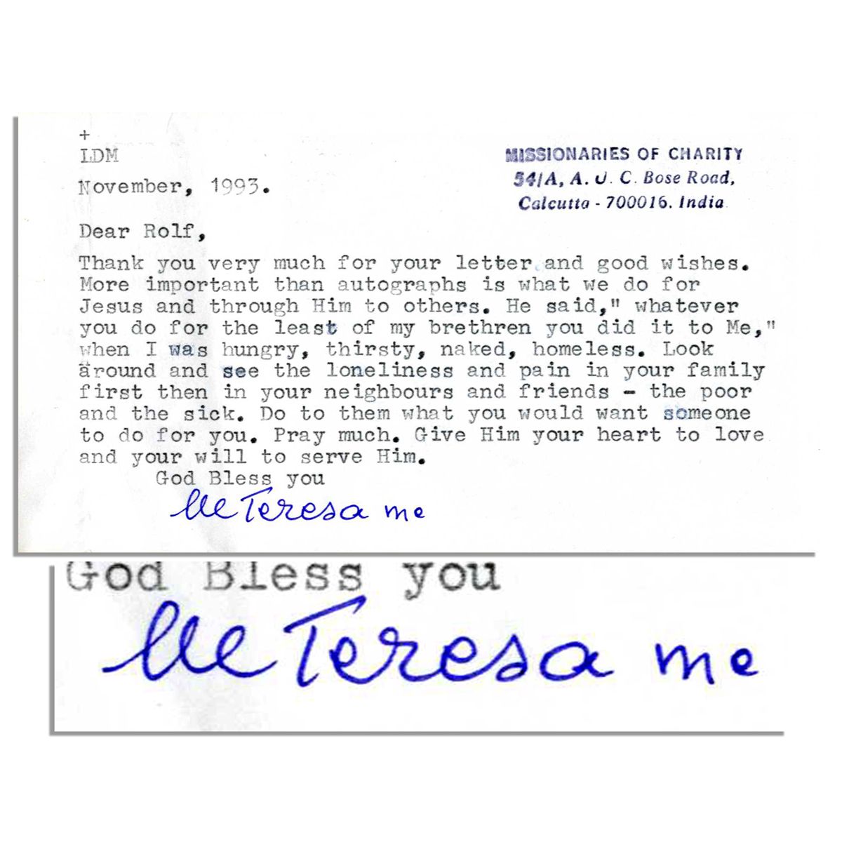 Poignant letter signed by Mother Teresa, dated November 1993 from Calcutta. Signed ''M Teresa mc [Missionaries of Charity] at the conclusion of the letter which reads, ''...He said, 'whatever you do for the least of my brethren you did it to Me,' when I was hungry, thirsty, naked, homeless. Look around and see the loneliness and pain in your family first then in your neighbours and friends - the poor and the sick. Do to them what you would want someone to do for you...'' Letter on back of prayer card measures 6.25'' x 3.75''. Very good.