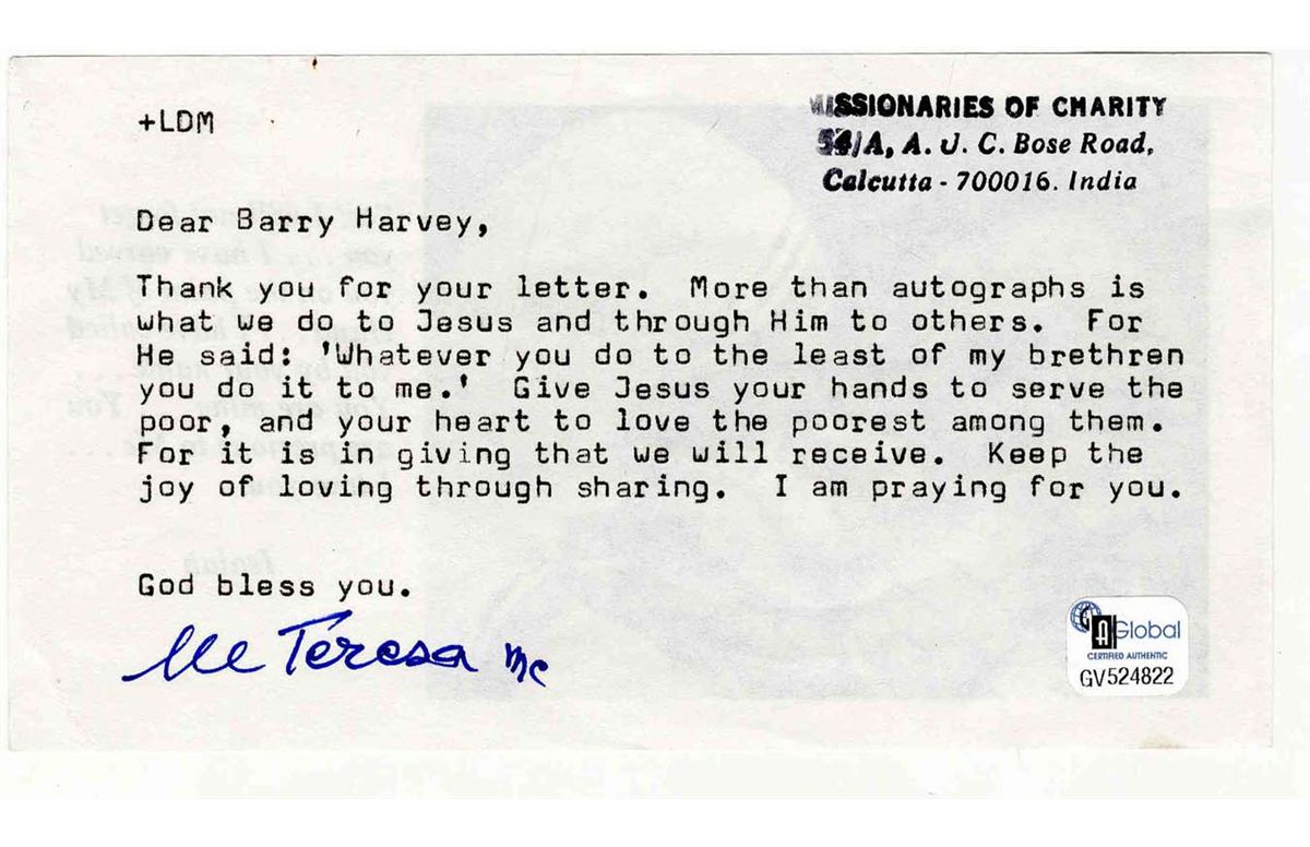 Mother Teresa typed letter signed ''M Teresa MC [Missionaries of Charity].'' In part, ''...Thank you for your letter. More than autographs is what we do to Jesus and through Him to others. For He said: 'Whatever you do to the least of my brethren you do it to me.' Give Jesus your hands to serve the poor, and your heart to love the poorest among them. For it is in giving that we will receive. Keep the joy of loving through sharing. I am praying for you...'' 6.5'' x 3.5'' page is in very good condition with a GAI sticker to lower right.