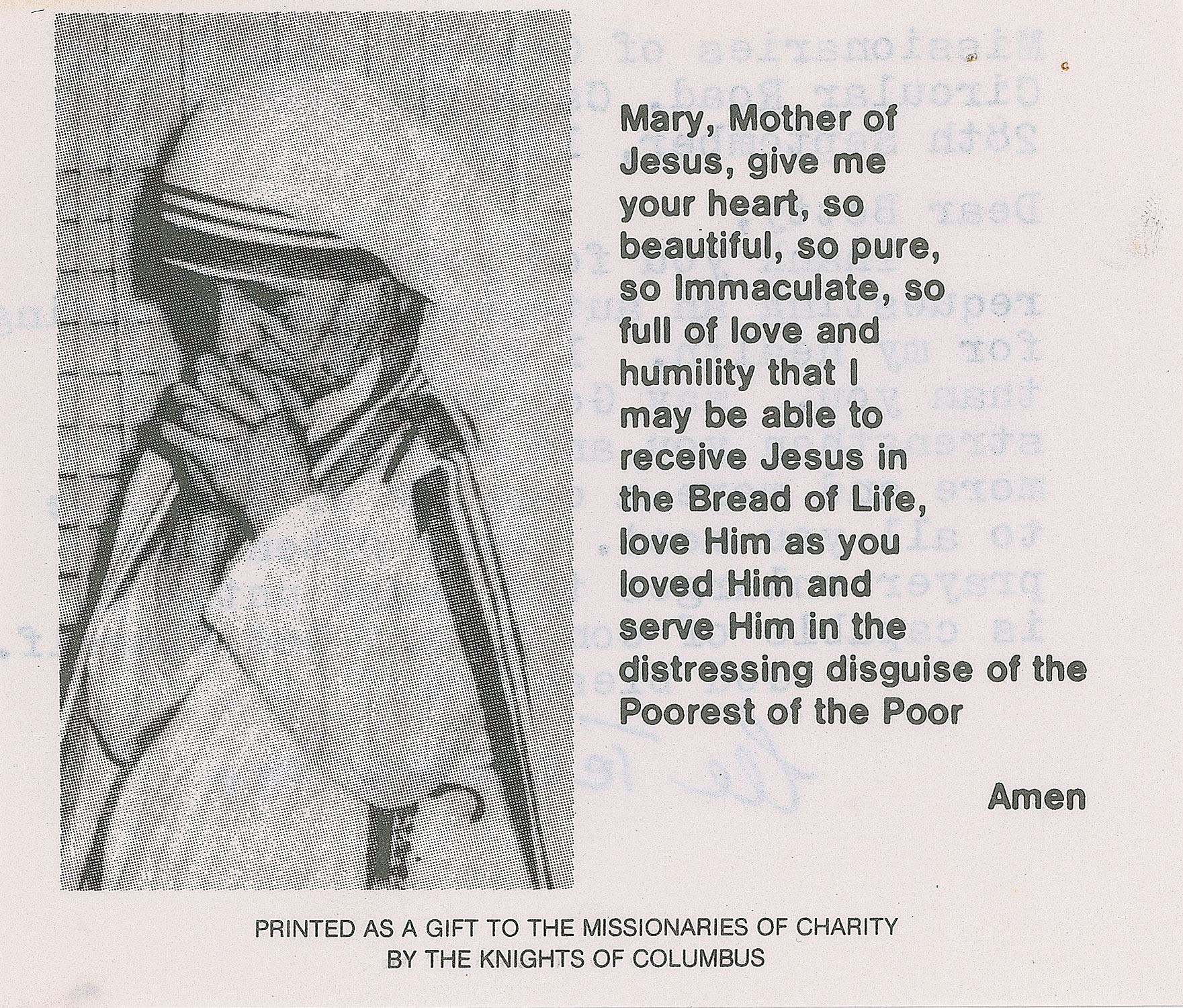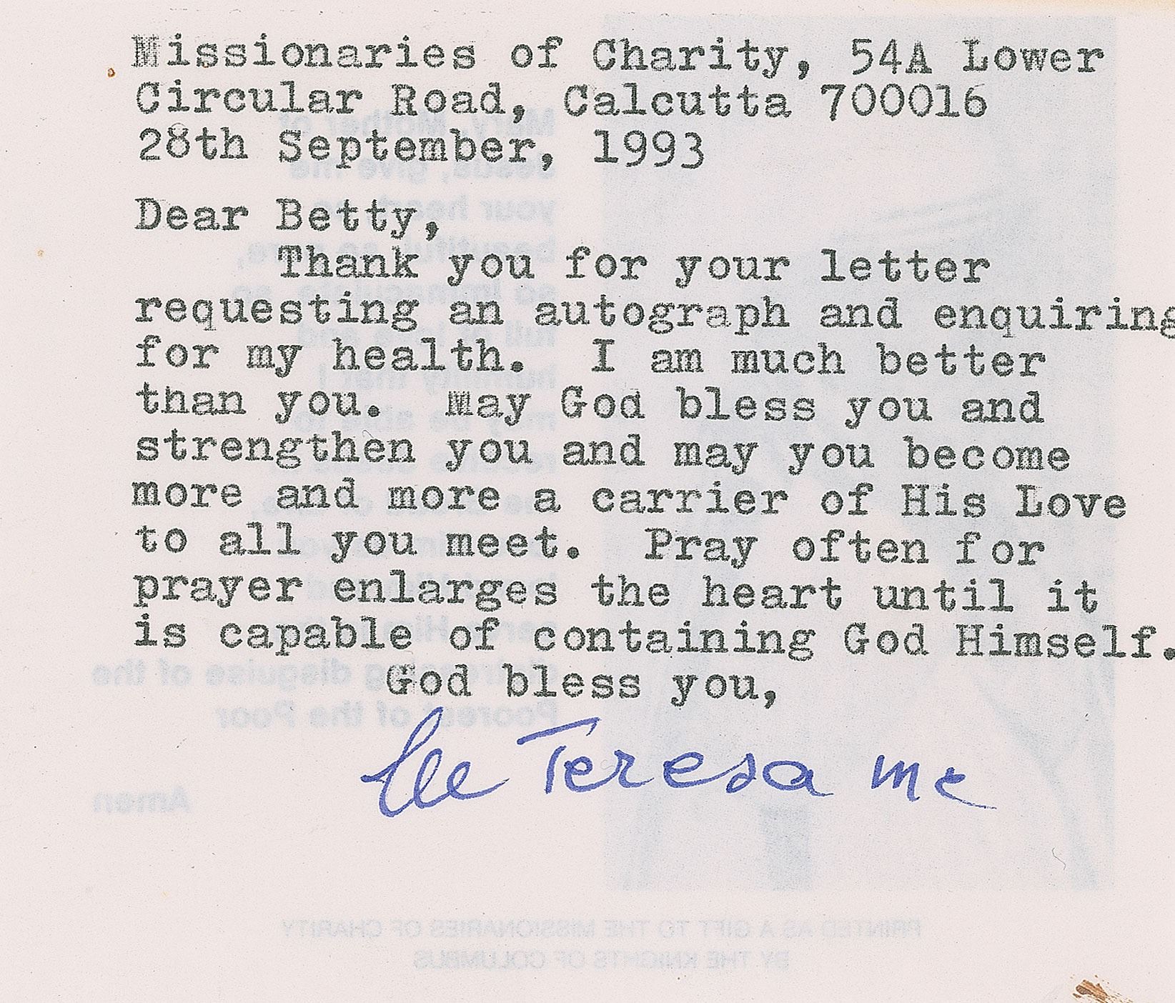 TLS signed “M Teresa mc,” one page on the reverse of a 4.25 x 3.5 prayer slip depicting Mother Teresa, September 28, 1993. Letter to Betty Paterson, in full: "Thank you for your letter requesting an autograph and enquiring for my health. I am much better than you. May God bless you and strengthen you and may you become more and more a carrier of His Love to all you meet. Pray often for prayer enlarges the heart until it is capable of containing God Himself. God bless you." In fine condition. Accompanied by the original mailing envelope.