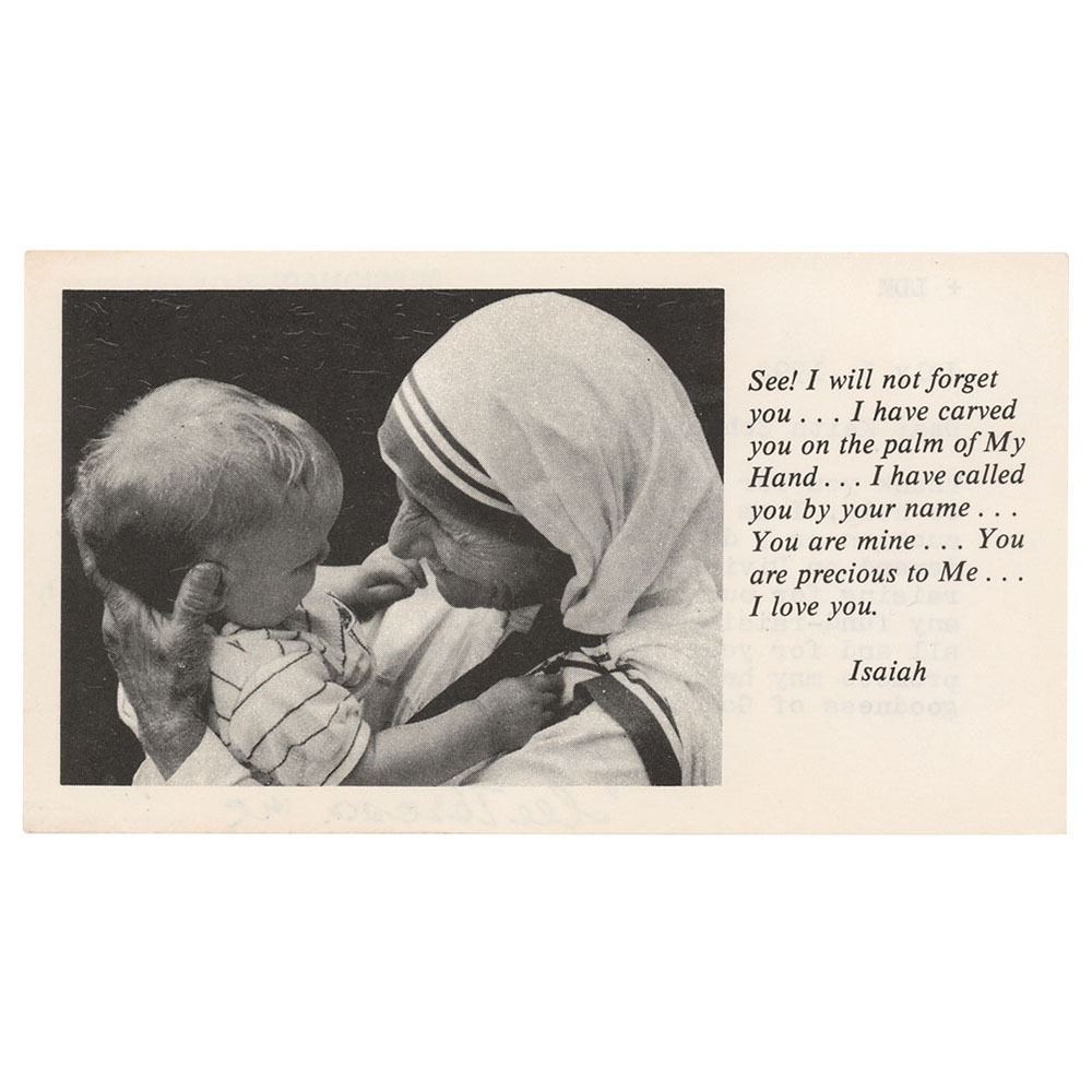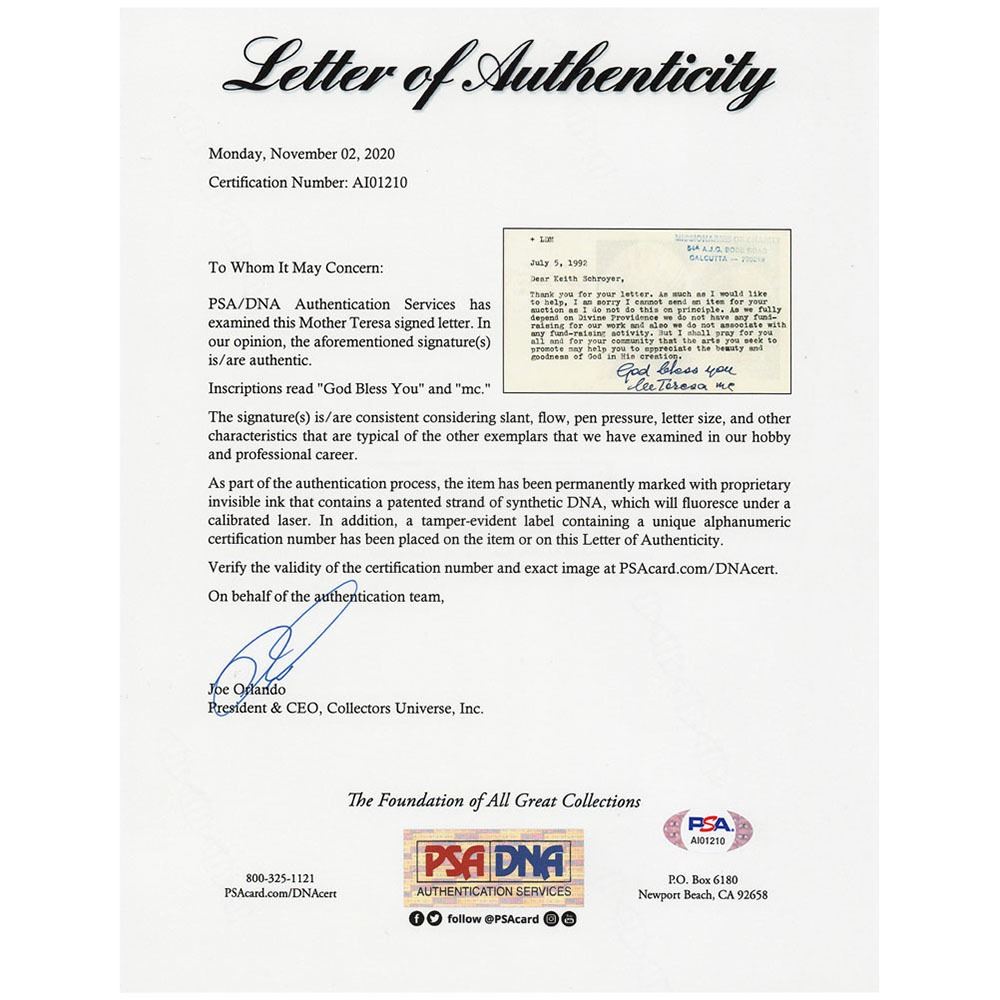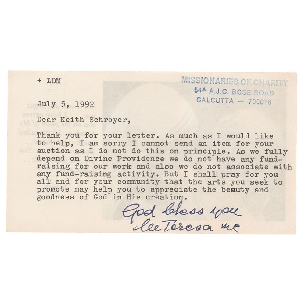 TLS signed “God bless you, M Teresa mc,†one page on the reverse of a 6.25 x 3.5 prayer slip, July 5, 1992. Letter to Keith Schroyer, in part: "I am sorry I cannot send an item for your auction as I do not do this on principle. As we fully depend on Divine Providence we do not have any fund-raising for our work and also we do not associate with any fund-raising activity. But I shall pray for you all and for your community that the arts you seek to promote may help you to appreciate the beauty and goodness of God in His creation." In very fine condition. Accompanied by a full letter of authenticity from PSA/DNA.