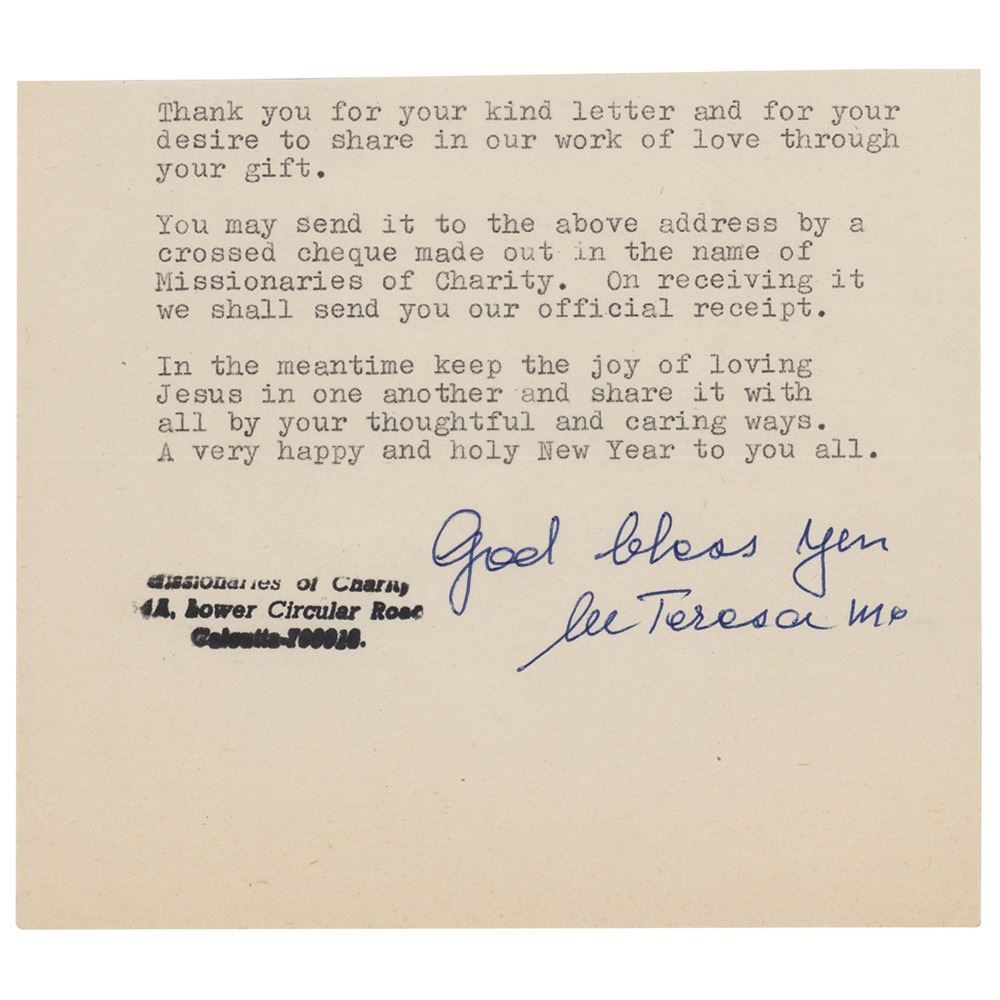 Partial TLS signed “God bless you, M Teresa mc,†one page, 5.75 x 5, no date. In full: "Thank you for your kind letter for your desire to share in our work of love through your gift. You may send it to the above address by a crossed cheque made out in the name of Missionaries of Charity. On receiving it we shall send you our official receipt. In the meantime keep the joy of loving Jesus in one another and share it with all by your thoughtful and caring ways. A very happy and holy New Year to you all." In fine condition, with the top of the letter trimmed off.