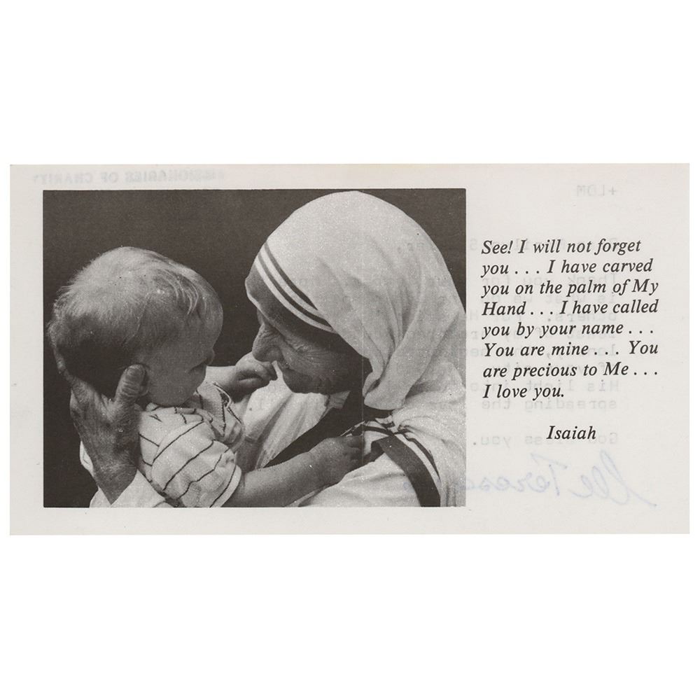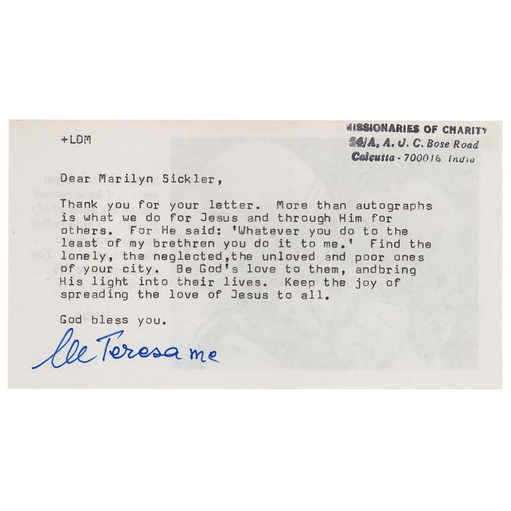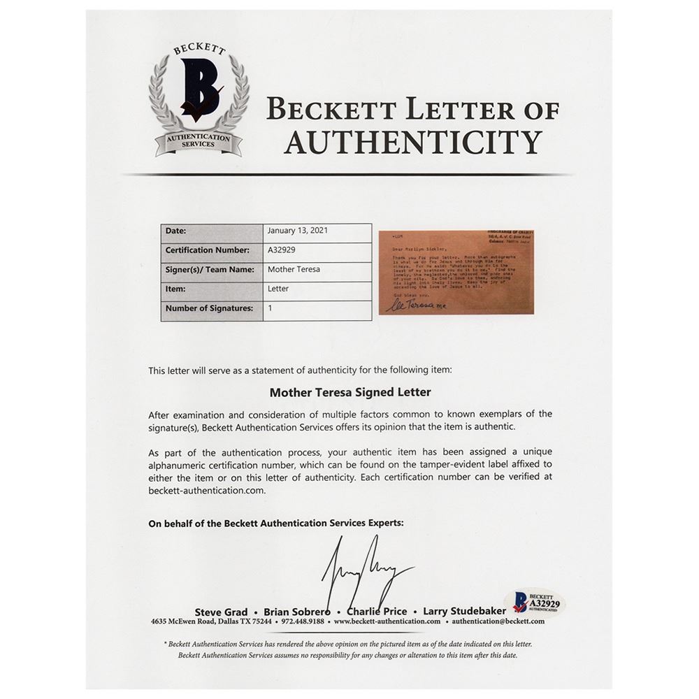 TLS signed “M Teresa mc,†one page on the reverse of a 6.5 x 3.5 prayer slip, no date. Letter to Marilyn Sickler, in part: "More important than autographs is what we do for Jesus and through Him for others. For He said: 'Whatever you do to the least of my brethren you do it to me.' Find the lonely, the neglected, the unloved and poor ones of your city. Be God's love to them, and bring His light into their lives. Keep the joy of spreading the love of Jesus to all." In very fine condition. Accompanied by the original mailing envelope and a full letter of authenticity from Beckett Authentication Services.