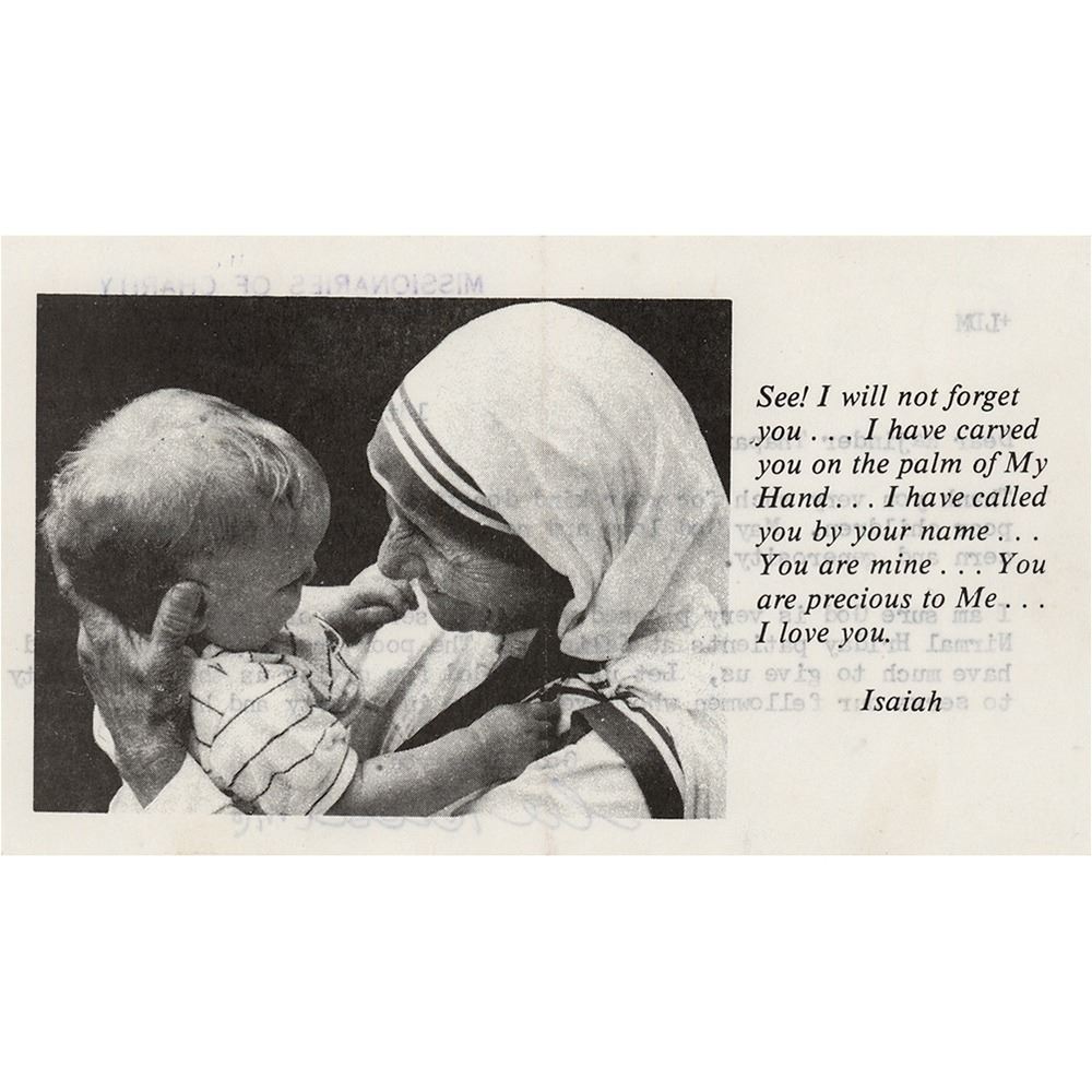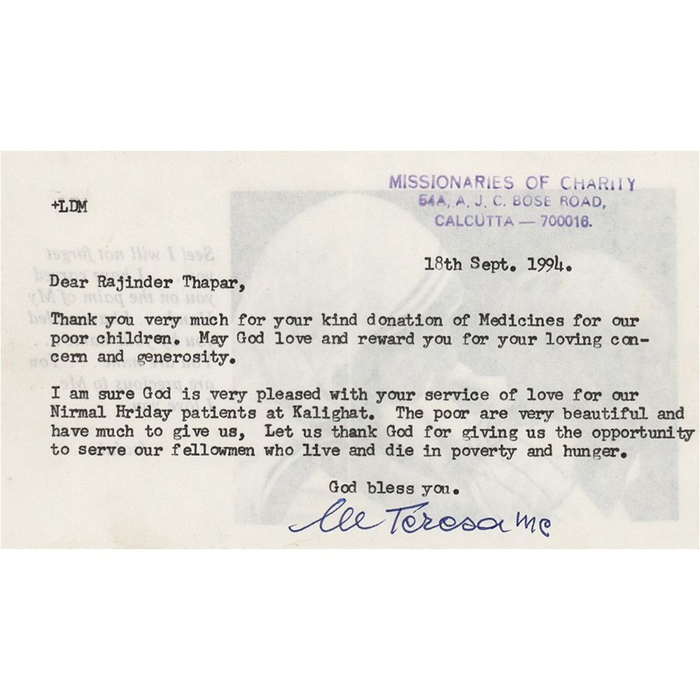 TLS signed “M Teresa mc,” one page, 6.25 x 3.5, stamped Missionaries of Charity letterhead on the reverse of a prayer slip, September 18, 1994. Letter to Rajhinder Thapar, in full: "Thank you very much for your kind donation of Medicines for our poor children. May God love and reward you for your loving concern and generosity. I am sure God is very pleased with your service of love for our Nirmal Hriday patients at Kalighat. The poor are very beautiful and have much to give us, Let us thank God for giving us the opportunity to serve our fellowmen who live and die in poverty and hunger." In fine condition.