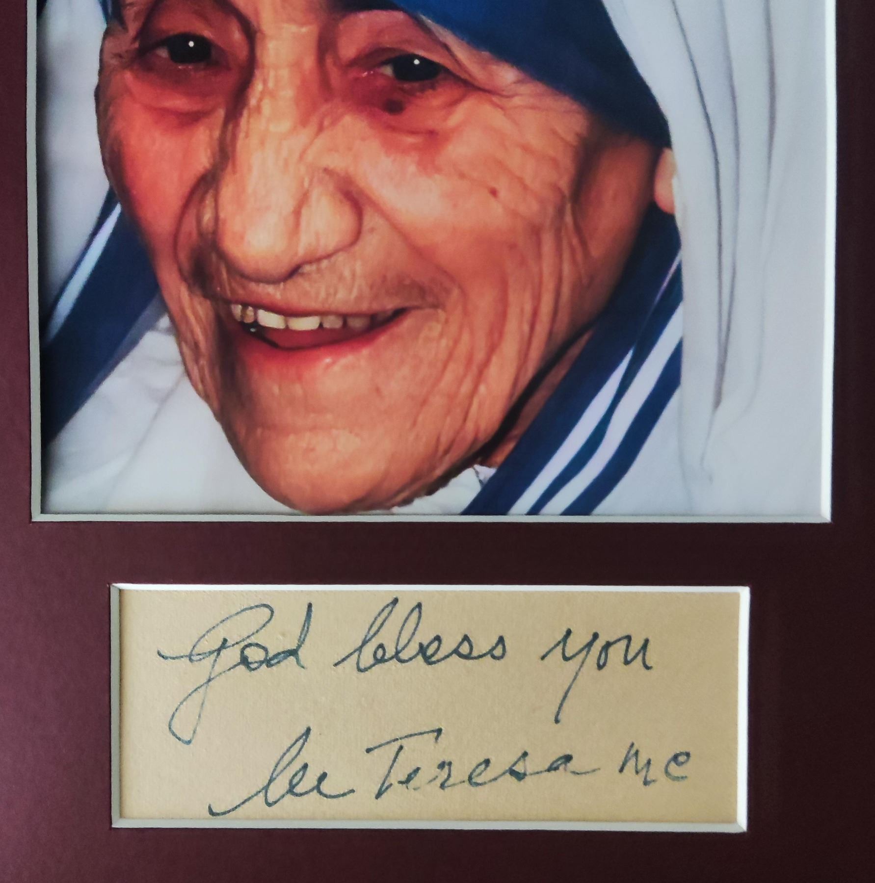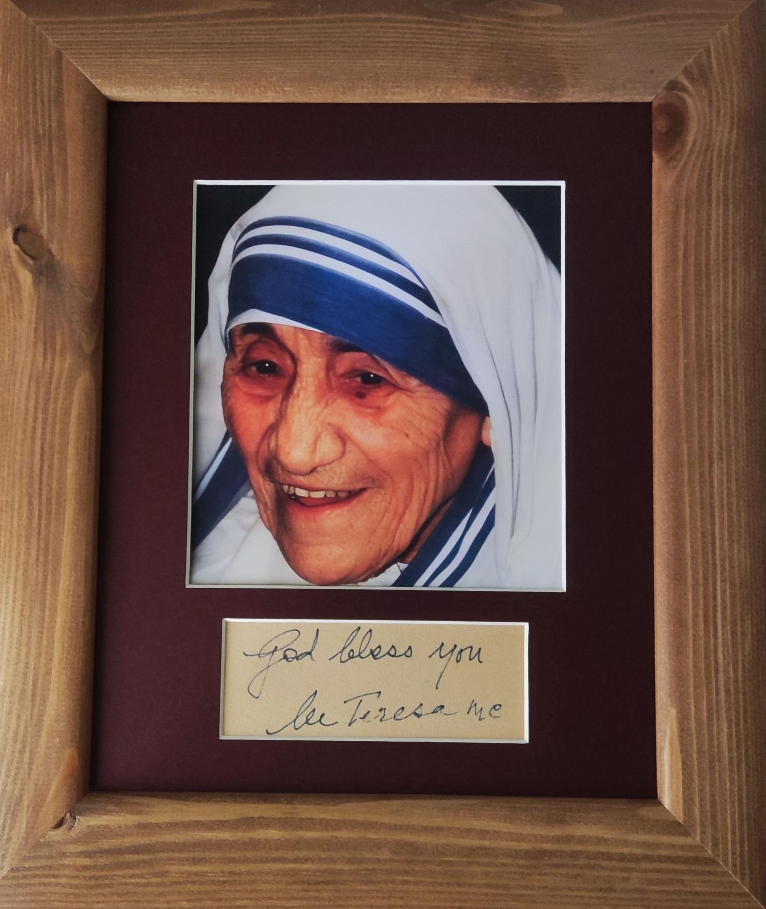 An autograph from Mother Teresa. Mounted and framed, and supplied with coa.