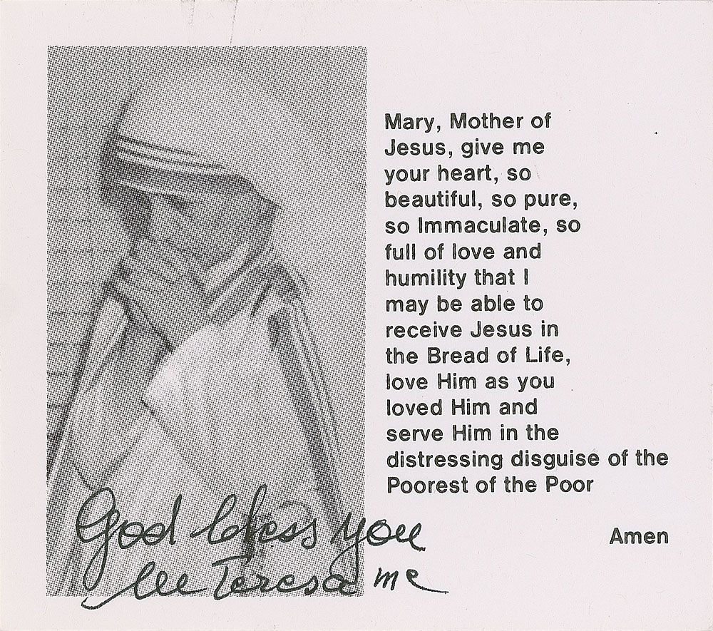 Printed prayer slip, 4.25 x 5.5, with an image of Mother Teresa with her hands clasped in prayer, signed at the bottom in black ink, “God bless you, M Teresa mc.” In fine condition.