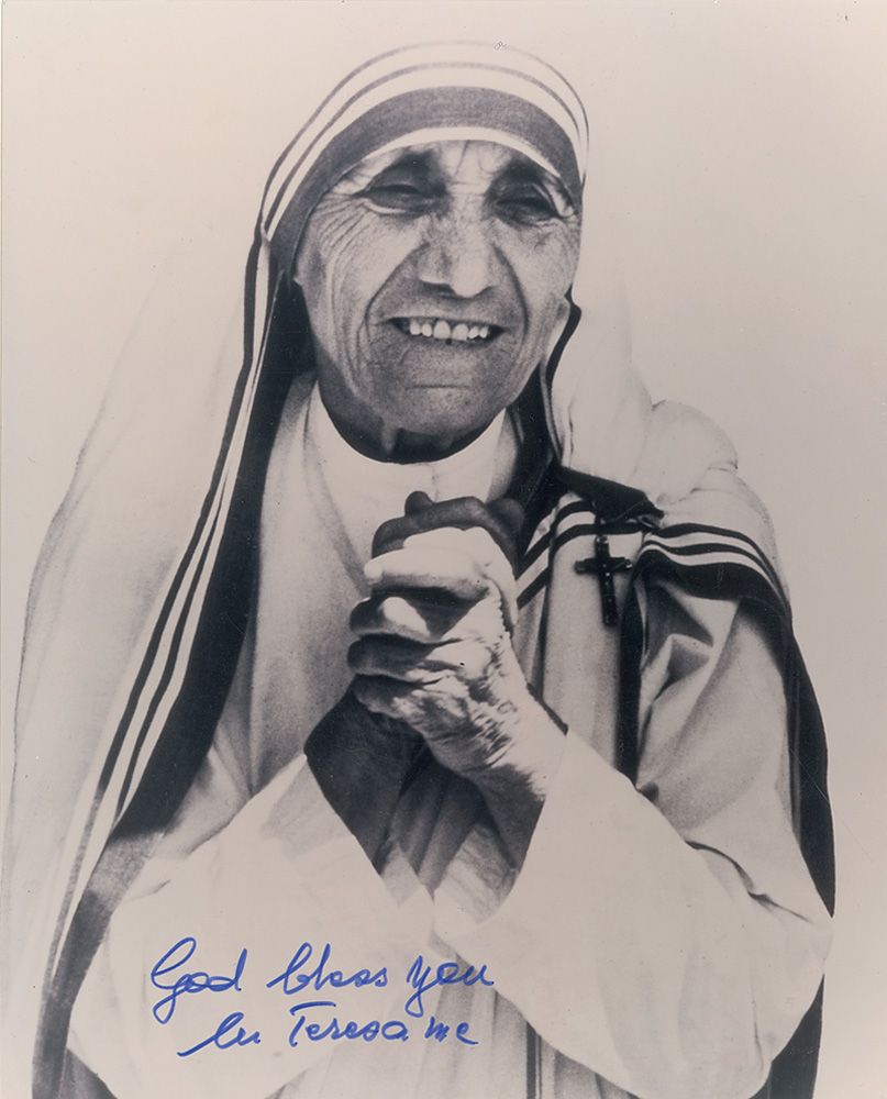 Glossy 8 x 10 photo of Mother Teresa with her hands clasped in prayer, signed in blue felt tip, “God bless you, M. Teresa mc.” In fine condition, with a couple creases.
