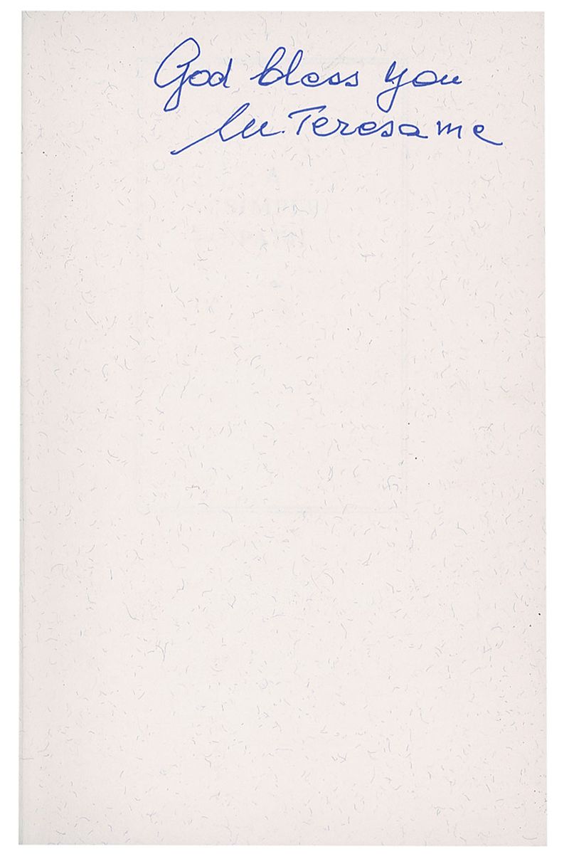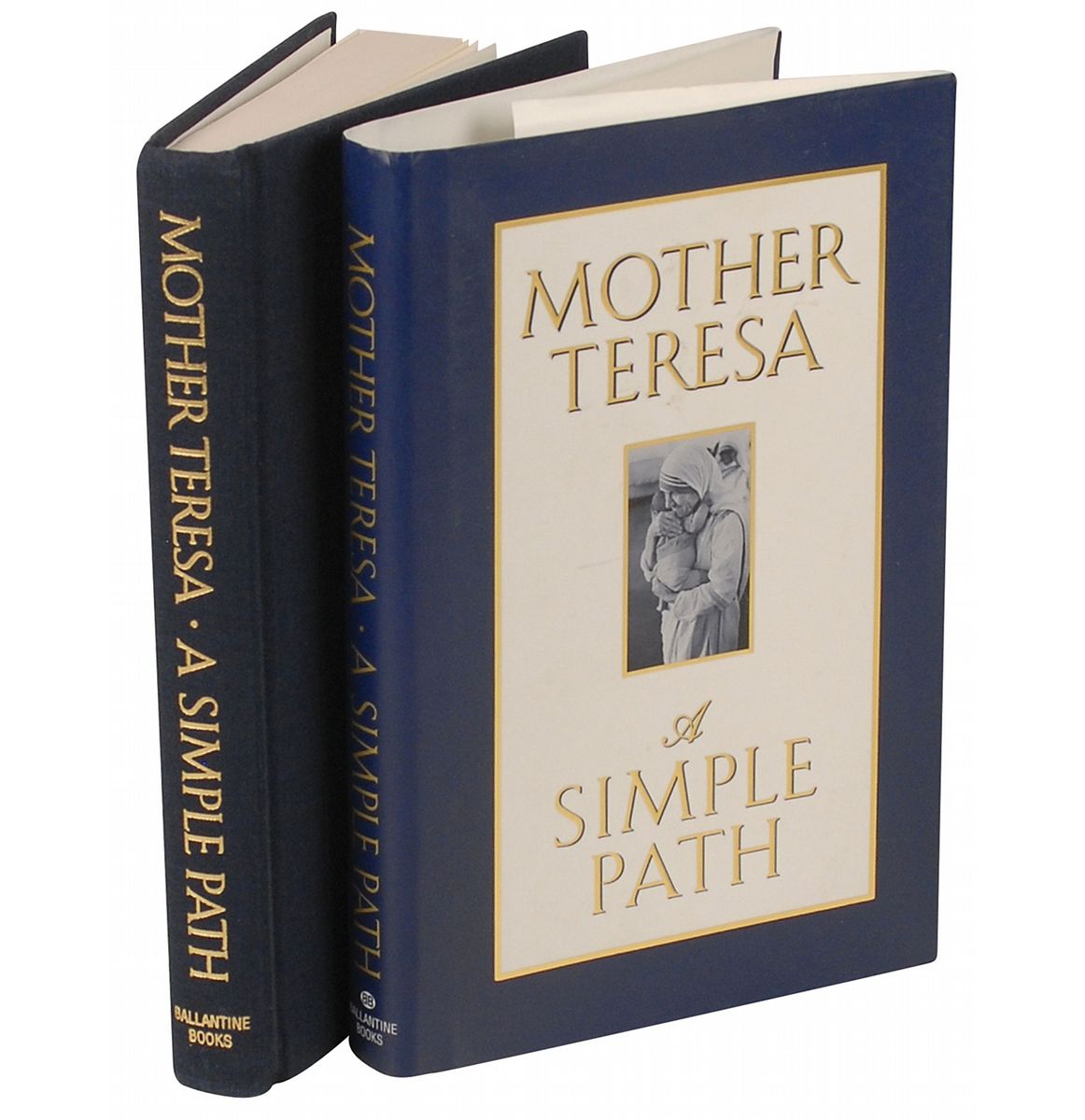 Signed book: A Simple Path. First edition, first printing. NY: Ballantine Books, 1995. Hardcover with dust jacket, 5.5 x 8.25, 202 pages. Signed on the first free end page in blue felt tip, “God bless you, M. Teresa mc.” Autographic condition: fine. Book condition: NF/VG+. Navy cloth-covered boards with gilt lettering to spine; minimal rubbing to edges. Dust jacket has minor creasing at corners/spine-ends and some very slight rubbing.