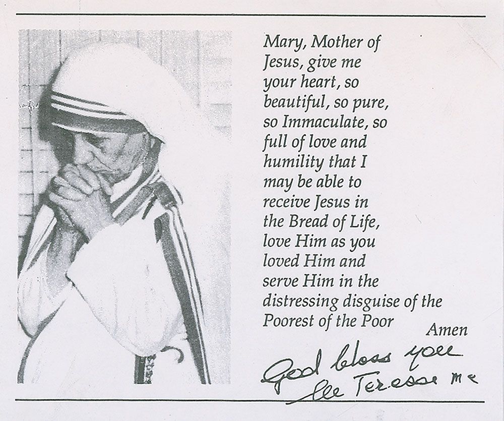 Printed prayer slip, 5.5 x 4.25, with an image of Mother Teresa with her hands clasped in prayer, signed at the bottom in black ink, “God bless you, M Teresa mc.” In fine condition.