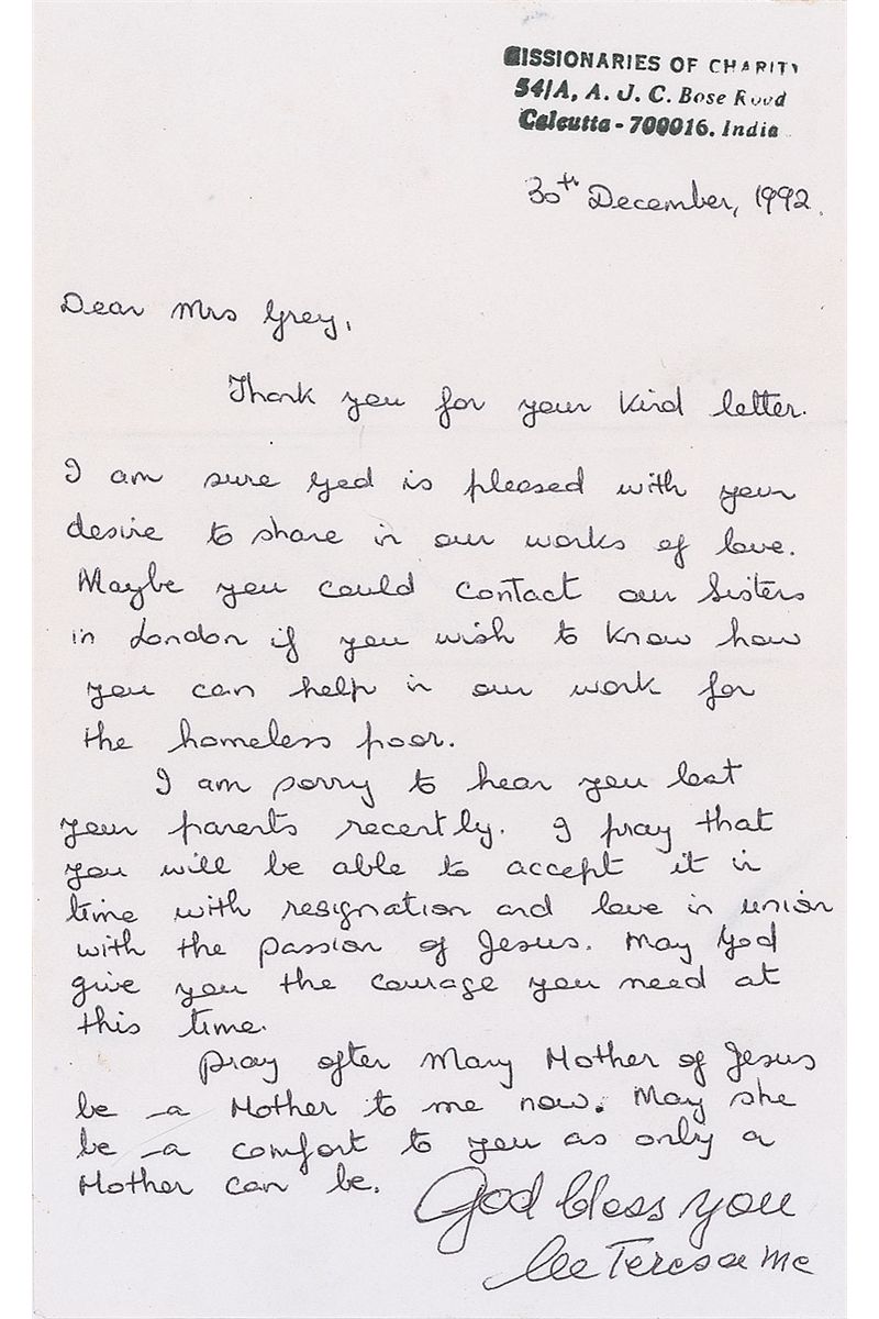 LS signed “God bless you, M Teresa mc,” one page, 5 x 8, blind-stamped Missionaries of Charity letterhead, December 30, 1992. Letter to a contributor. In part: “I am sure God is pleased with your desire to share in our works of love. Maybe you could contact our Sisters in London if you wish to know how you can help in our work for the homeless poor.” In fine condition, with a few scattered creases and wrinkles.