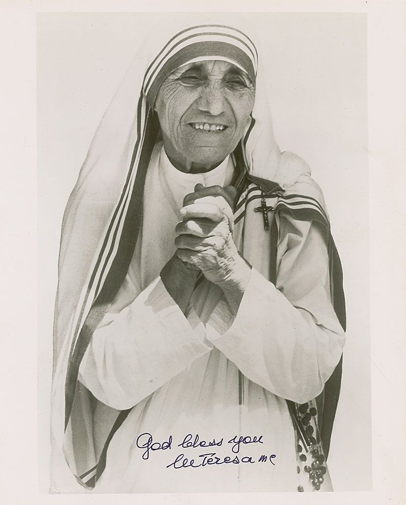 Glossy 8 x 10 photo of Mother Teresa with her hands clasped in prayer, signed in black felt tip, “God bless you, M. Teresa mc.” In fine condition, with light scattered surface creases and impressions. Accompanied by a full letter of authenticity from JSA.