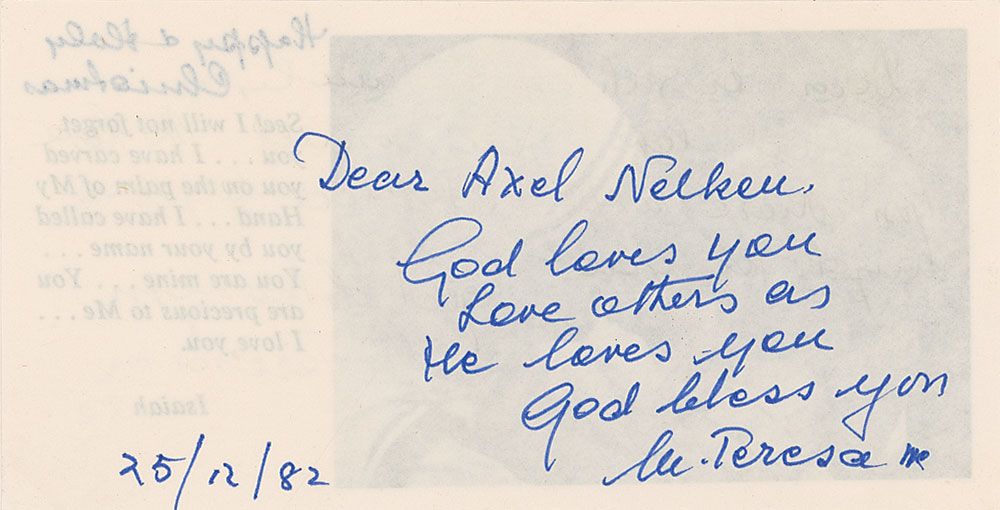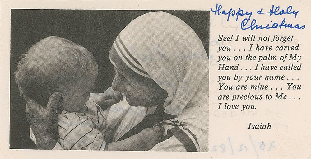 ANS signed “M. Teresa mc,” on the reverse of a 6.25 x 3 prayer slip, December 25, 1982. Brief note reads, in full: “God loves you. Love others as he loves you. God bless you.” On the reverse of the slip, she adds, “Happy & Holy Christmas,” above the printed prayer. In fine condition.