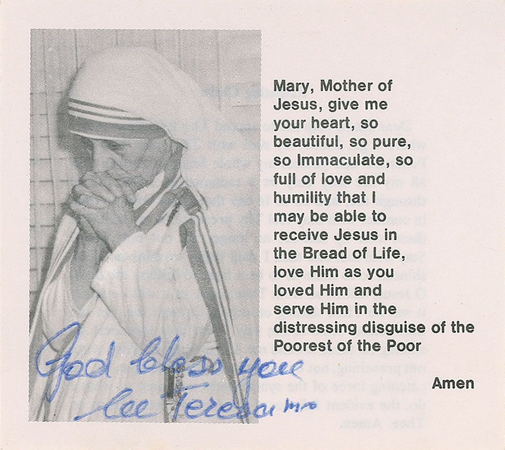Printed prayer slip, 4.25 x 5.5, with an image of Mother Teresa with her hands clasped in prayer, signed at the bottom in blue felt tip, “God bless you, M Teresa mc.” In fine condition.