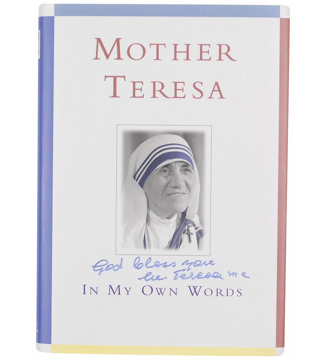 Signed book: In My Own Words. First edition, later printing. London: Hodder and Stoughton, 1996. Hardcover with dust jacket, 5.25 x 7.25, 109 pages. Signed on the dust jacket in blue ink, “God bless you, M. Teresa mc.” In fine condition, with some light foxing to fore-edges.