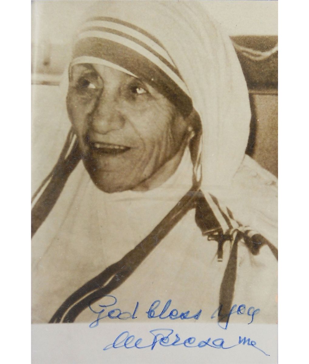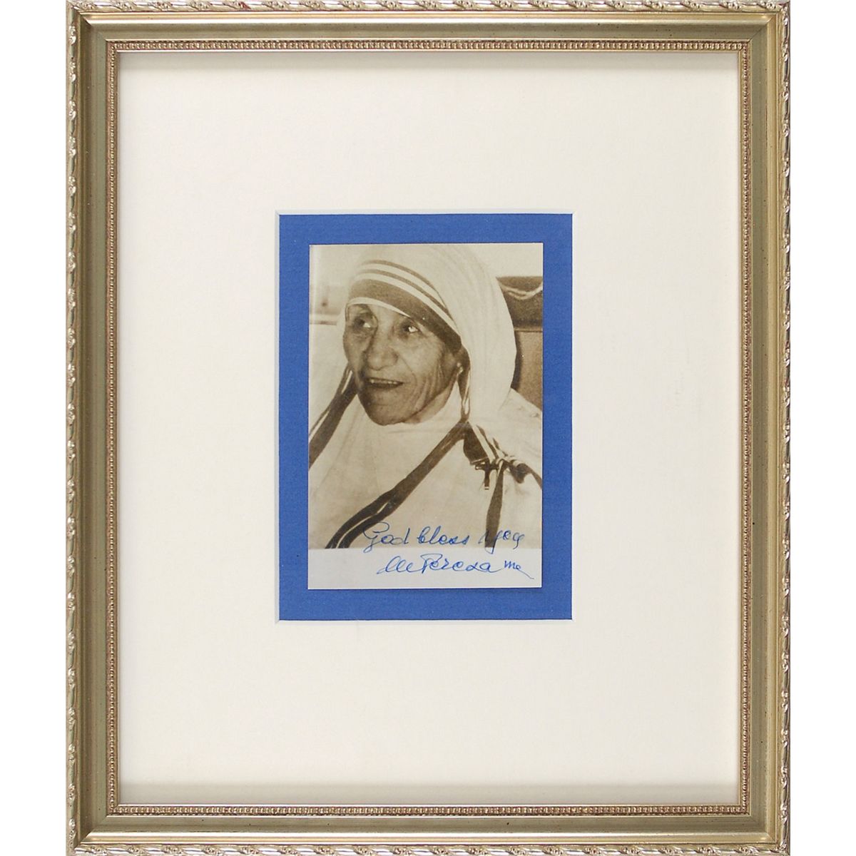 Glossy 3 x 4.25 photo of Mother Teresa, signed at the bottom of the image in blue felt tip, “God bless you, M Teresa mc.” Matted and framed to an overall size of 9 x 11. In fine condition, with a scuff to the frame’s plexiglass.