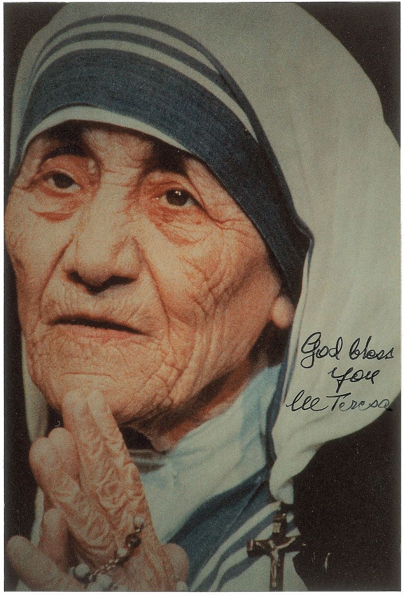 Color glossy 4 x 5.75 photo of Mother Teresa with her hands together in prayer, signed in black ink, “God bless you, M. Teresa.” Reverse is stamp-dated March of 1993. In fine condition, with a slightly grainy quality to the image.