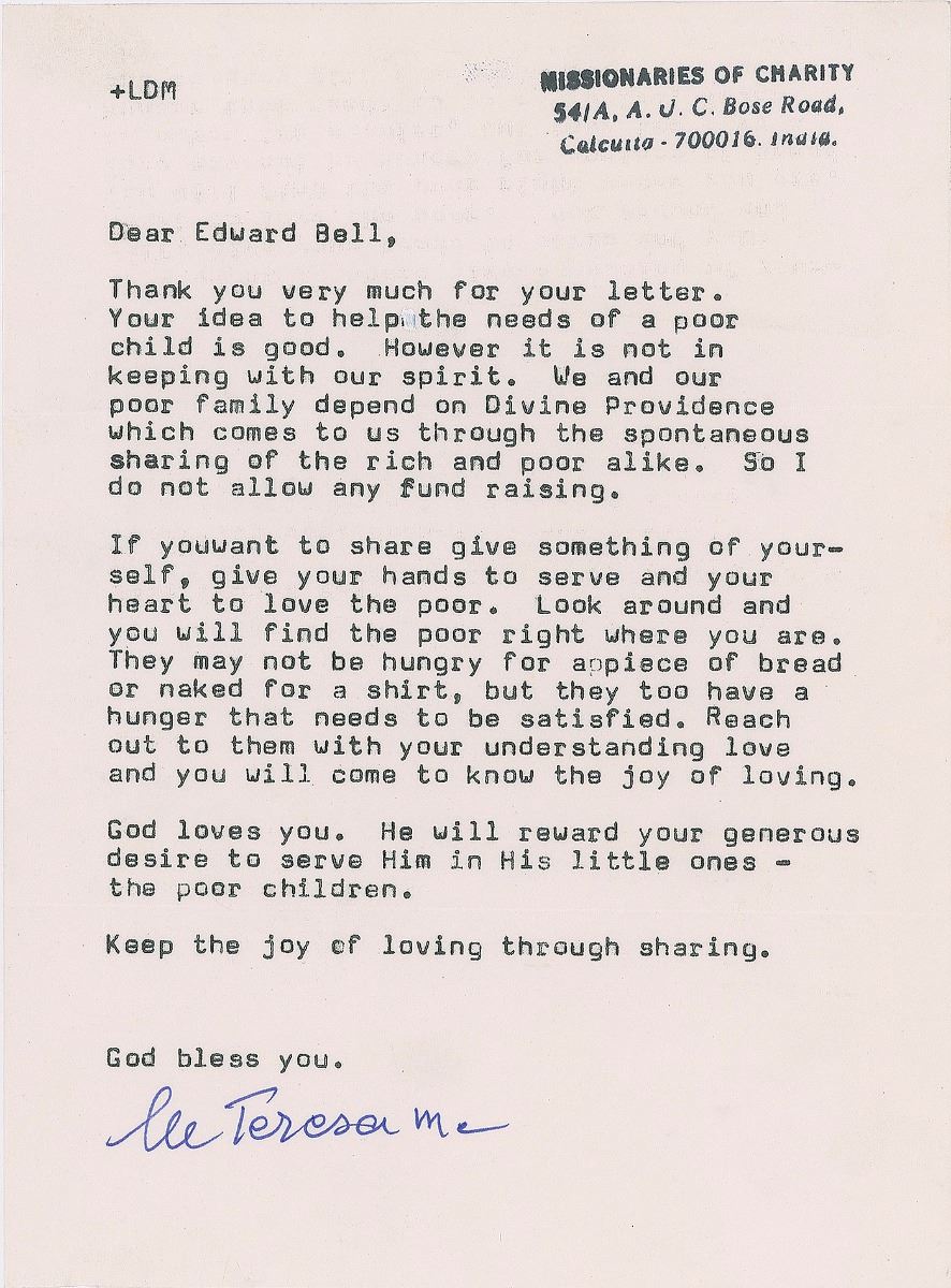 TLS signed “M. Teresa mc,” one page, 5.5 x 7.5, stamped Missionaries of Charity letterhead, no date. Thoughtful letter, in part: “If you want to share something of yourself, give your hands to serve and your heart to love the poor. Look around and you will find the poor right where you are. They may not be hungry for a piece of bread or naked for a shirt, but they too have a hunger that needs to be satisfied. Reach out to them with your understanding love and you will come to know the joy of loving. God loves you. He will reward your generous desire to serve Him in His little ones—the poor children. Keep the joy of loving through sharing.” In fine condition.