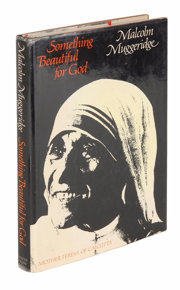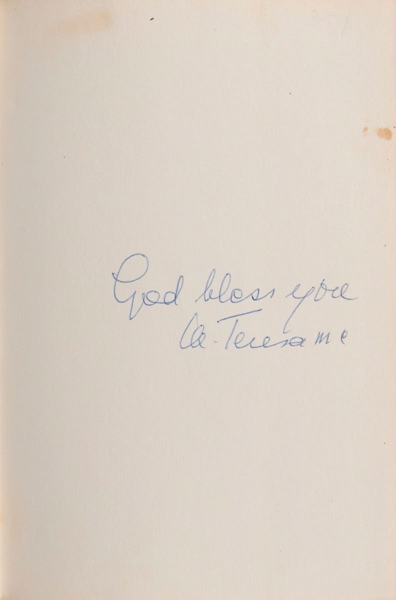 Signed book: Something Beautiful for God. Later printing. NY: Harper & Row, 1971. Hardcover with dust jacket, 6 x 8.75, 156 pages. Signed on the first free end page in blue ballpoint, “God bless you, M. Teresa mc.” In fine condition, with a couple of small stains in upper blank areas of the signed page.