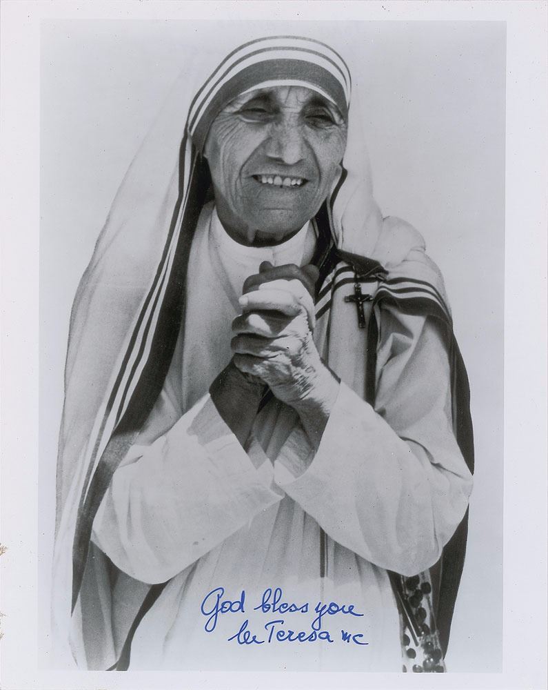 Glossy 8 x 10 half-length photo of the beneficent Mother Teresa with her hands clasped in prayer, signed in blue felt tip, "God bless you, M. Teresa mc." In fine condition.