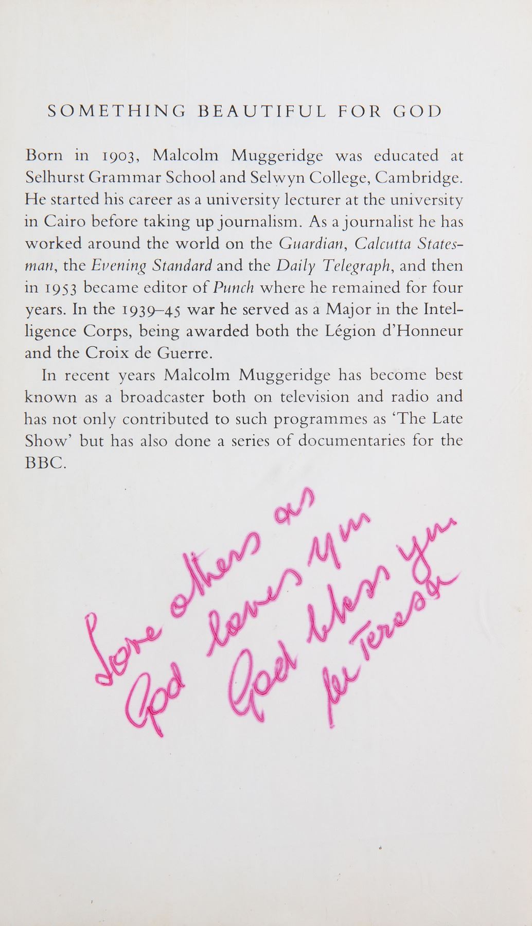 Signed book: Something Beautiful for God. Later printing. London: Collins/Fount Paperbacks, 1980. Softcover, 4.25 x 7, 156 pages. Signed on a prefatory page in red ink, "Love others as God loves you, God bless you, M. Teresa." In fine condition.