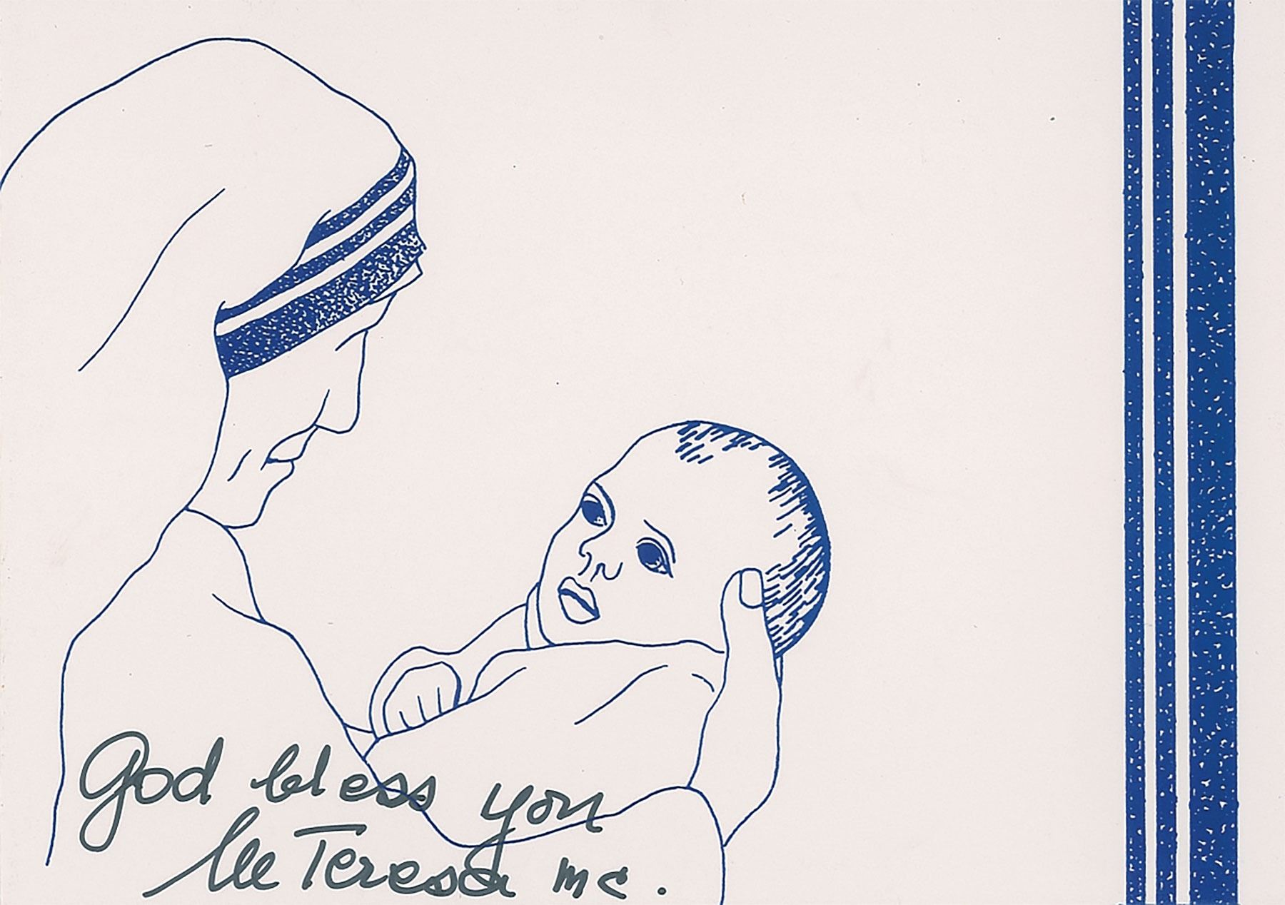 Card depicting Mother Teresa holding a baby, 6 x 4, signed on the front in black felt tip, "God bless you, M. Teresa mc." In very fine condition.