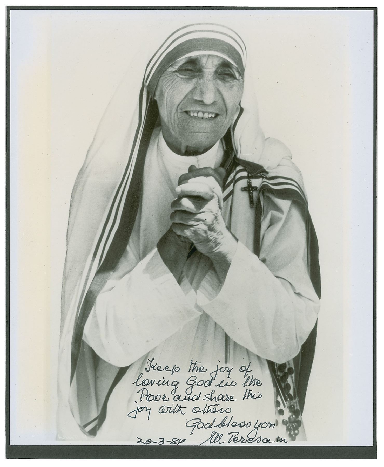 Glossy 8 x 9.5 half-length photo of Mother Teresa with her hands clasped in prayer, signed in thin black felt tip, "Keep the joy of loving God in the Poor and share this joy with others, God bless you, M. Teresa m, 20–3–84." Affixed to a slightly larger piece of cardstock. In very good to fine condition, with a crease to the upper right corner, and a block of toning from prior display.