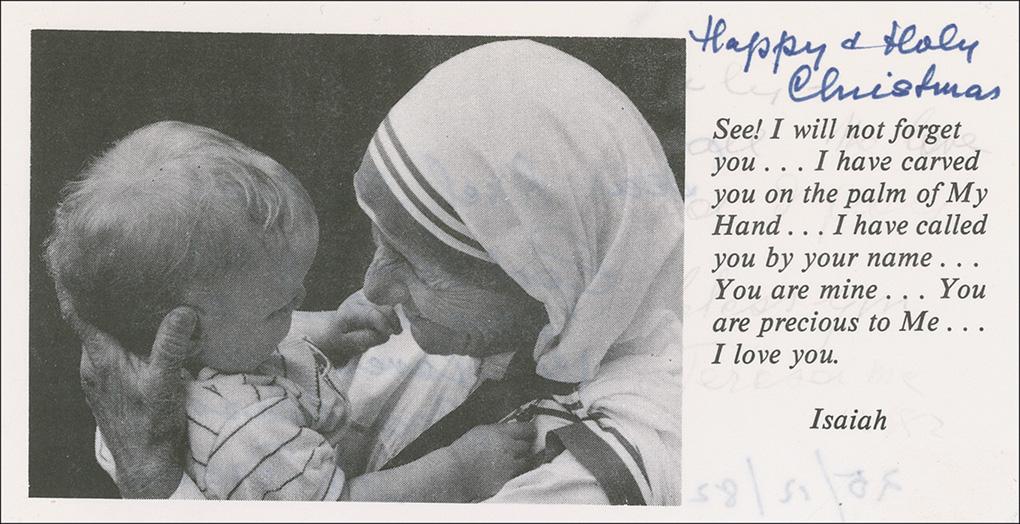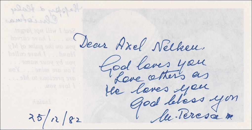 ANS signed “M. Teresa mc,” on the reverse of an off-white 6.25 x 3.25 prayer slip with a photo of Mother Teresa holding an infant, December 25, 1982. Mother Teresa writes, “Dear Axel Nelkeu, God loves you, Love others as He loves you. God bless you.” On the image side, above the pre-printed prayer, Mother Teresa also writes, “Happy & Holy Christmas.” In fine condition.