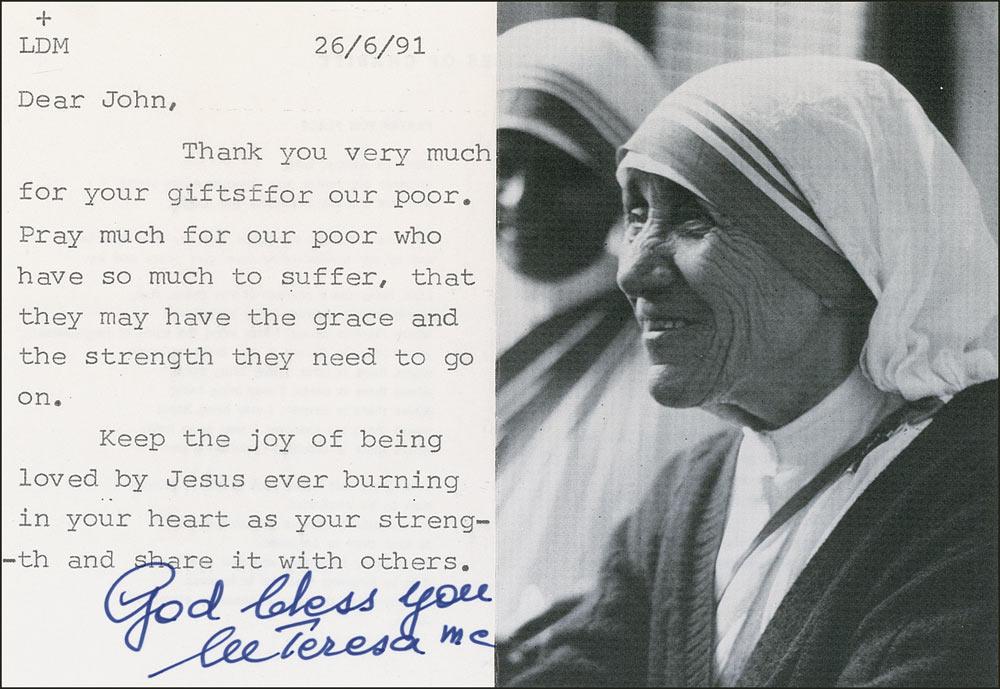TLS signed “M Teresa MC,” on a 6.25 x 4.25 prayer sheet, June 26, 1991. Letter of thanks for a financial donation. In part: “Thank you very much for your gifts for our poor. Pray much for our poor who have so much to suffer, that they may have the grace and the strength they need to go on.” Accompanied by the original mailing envelope, a photocopy of a news article on the original recipient, who trades four leaf clovers for signatures, one of which is included as well. In fine condition, with a bisecting vertical fold. RRAuction COA.