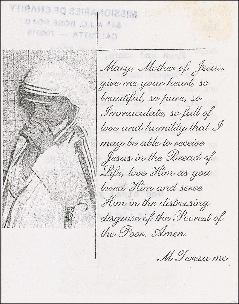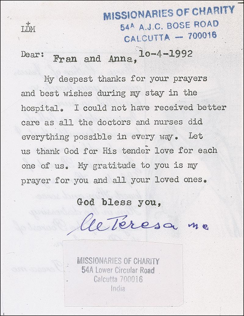 TLS signed “M Teresa mc,” on the reverse of a 4.25 x 5.5 printed prayer slip, stamped Missionaries of Charity letterhead, October 4, 1992. Letter of thanks to a supporter after a hospital stay. In part: “My deepest thanks for your prayers and best wishes during my stay in the hospital. I could not have received better care as all the doctors and nurses did everything possible in every way.” In very good condition, with vertical fold, one through a single letter of signature, return address affixed to bottom portion of letter, and adhesive remnants to reverse.