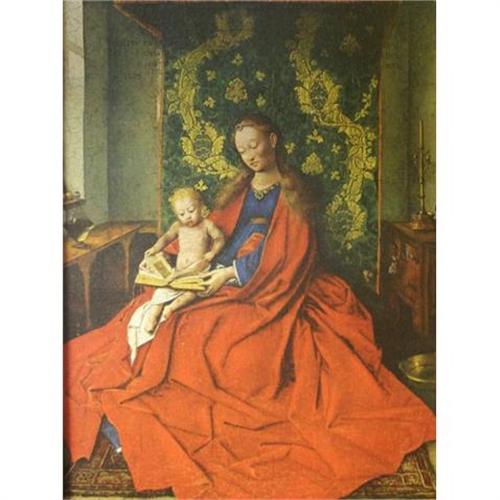 This exquisite print on canvas is a wonderful example of classical art. The rich crimson and emerald tones give the work a warm feeling while its intricate details draw the viewers eyes further inward. This popular subject matter of the mother and child is masterfully rendered, leaving no detail overlooked. Finished with a thick wooden frame brushed in gold tones with umber undertones, this lovely piece would be breathtaking in nearly any room. The artwork measures 27.5 inches by 21.5 inches including frame.