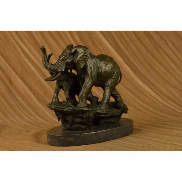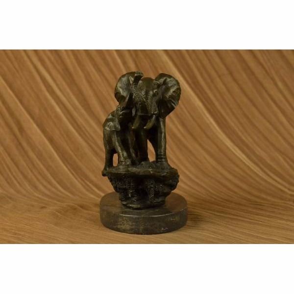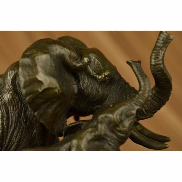 Mother and child as it is in the animal kingdom. The mother elephant walks beside her little elephant but a bit ahead for protection. The two animals walking in sync is such a pleasant and happy moment. These wondrous animals will surely delight your home. The piece is set on a black marble base. The lost wax method was used to craft this piece and allowed for the detail present throughout the entire sculpture