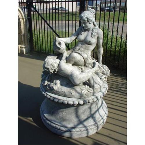 This serene and beautiful center fountain/statue is depicting a mother bathing her child. They are seated on a knoll with foliage, flowers, and grapes. Needless to say, this piece would compliment any style of decor or landscape.