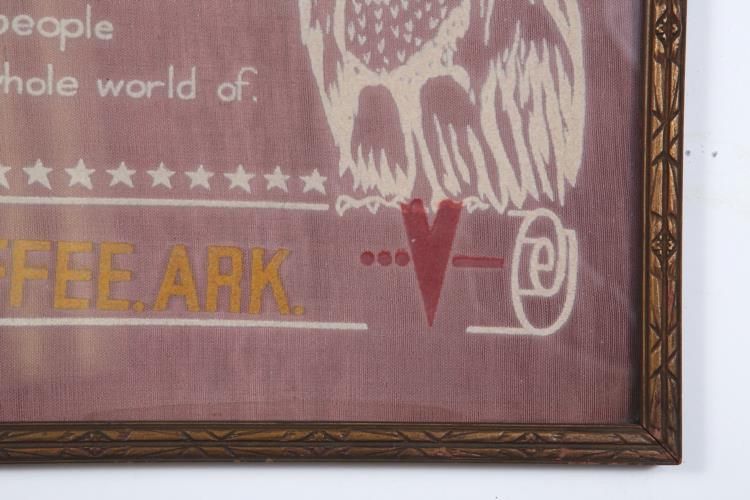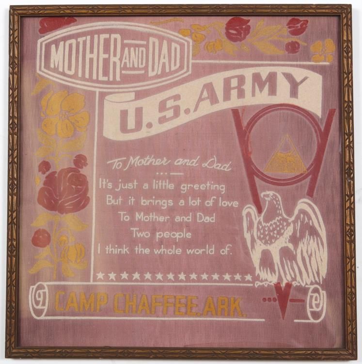Up for sale we have an old Mother and Dad US Army Camp Chaffee WWII Woven Cloth that is framed. The frame size is 16.75" x 16.75" and the image size is 16" x 16". Fort Chaffee, just outside of Fort Smith (Sebastian County) and Barling (Sebastian County) on Arkansas Highway 22, has served the United States as an army training camp, a prisoner of war camp, and a refugee camp. Currently, 66,000 acres are used by the Arkansas National Guard as a training facility, with the Arkansas Air National Guard using the fort s Razorback Range for target practice. Groundbreaking for what was then Camp Chaffee was held on September 20, 1941, as part of the Department of War s preparations to double the size of the U.S. Army in the face of imminent war. That month, the United States government paid $1.35 million to acquire 15,163 acres from 712 property owners, including families, farms, businesses, churches, schools, and other government agencies. The camp was named after Major General Adna R. Chaffee Jr., an artillery officer who, in Europe during World War I, determined that the cavalry was outmoded and, unlike other cavalry officers, advocated for the use of tanks. It took only sixteen months to build the entire base. The first soldiers arrived on December 7, 1941, the day the Japanese bombed Pearl Harbor, Hawaii. The installation was activated on March 27, 1942. From 1942 to 1946, the Sixth, Fourteenth, and Sixteenth Armored Divisions trained there. During World War II, it served as both a training camp and a prisoner-of-war (POW) camp. The major purpose of the camp was to train soldiers for combat and prepare units for deployment, but from 1942 to 1946, there were also 3,000 German POWs there. The creation of the camp caused the nearby town of Barling to experience a tremendous boom in housing and businesses.