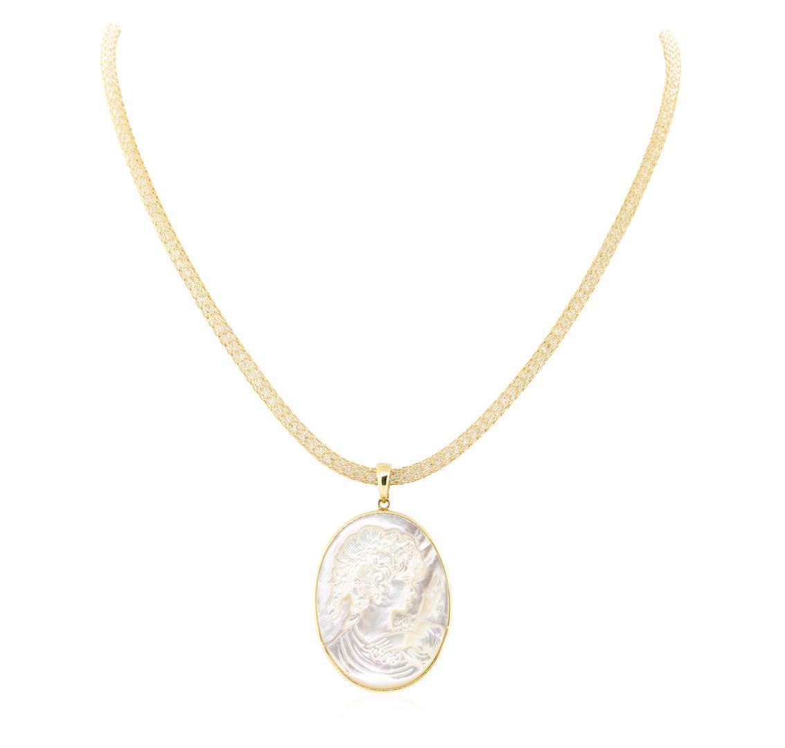 One mother of pearl oval shaped cameo pearl enhancer pendant measuring 40 by 30 millimeters with an attached 14KT yellow gold tube chain measuring nineteen and a half inches in length filled with cubic zirconias. The overall weight is 31.8 grams.
