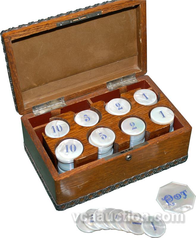 Mother of Pearl Chip Set w/ Buck - Set features 200 counters (1, 2, 5, and 10) and six-sided 'poker buck' measuring 2 1/8" D. The attractive, ornate trimmed caddy measures 8 ½" by 5 1/4" by 4" and may not be original to the counters, but matches the beauty of the counters.