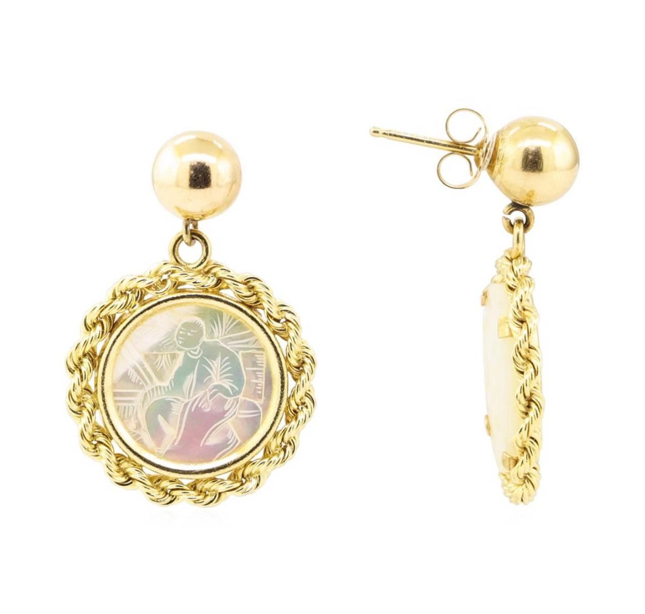 One pair of earrings with a dangle of 30mm featuring: 14KT yellow gold weighing 5.8 grams containing two mother of pearl coins measuring 13 millimeters in diameter.