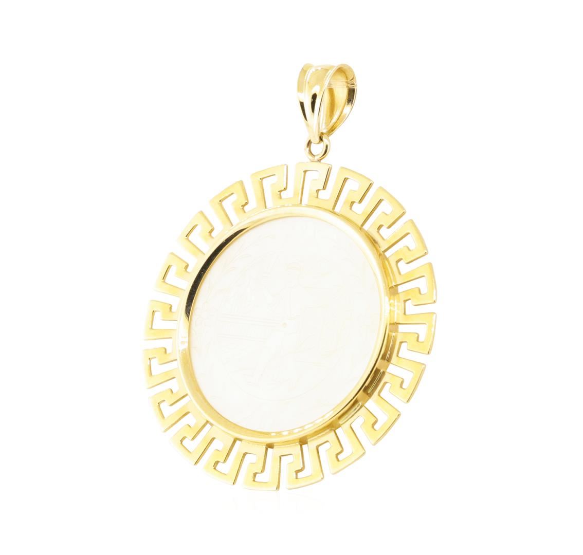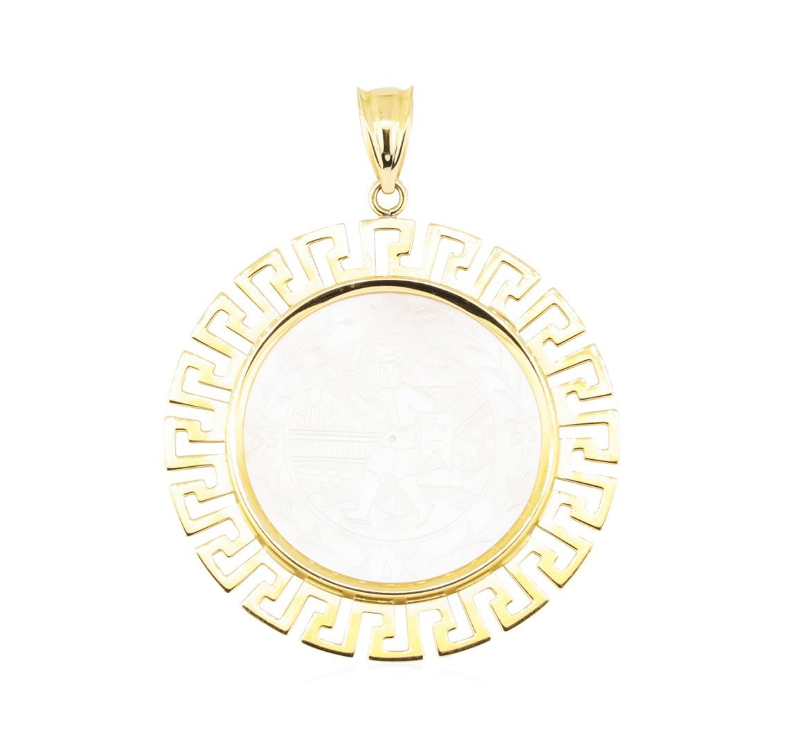 One pendant featuring: 14KT yellow gold weighing 6.7 grams containing one mother of pearl coin measuring approximately 25 millimeters in diameter.