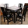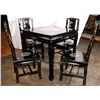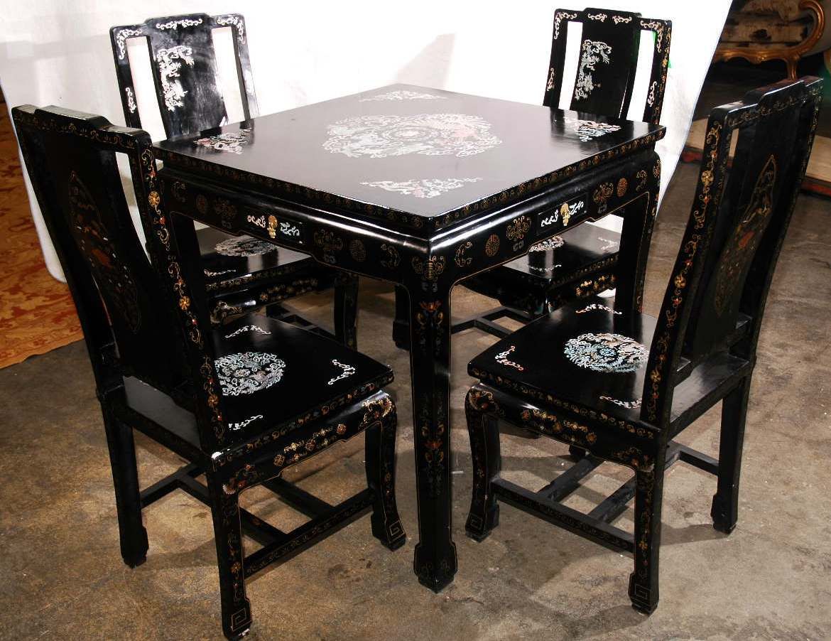 Asian intricate inlaid mother of pearl and gold leaf hand painted on handsome dark lacquer wood dining table with four chairs. Table dimensions 32" x 33" x 33"