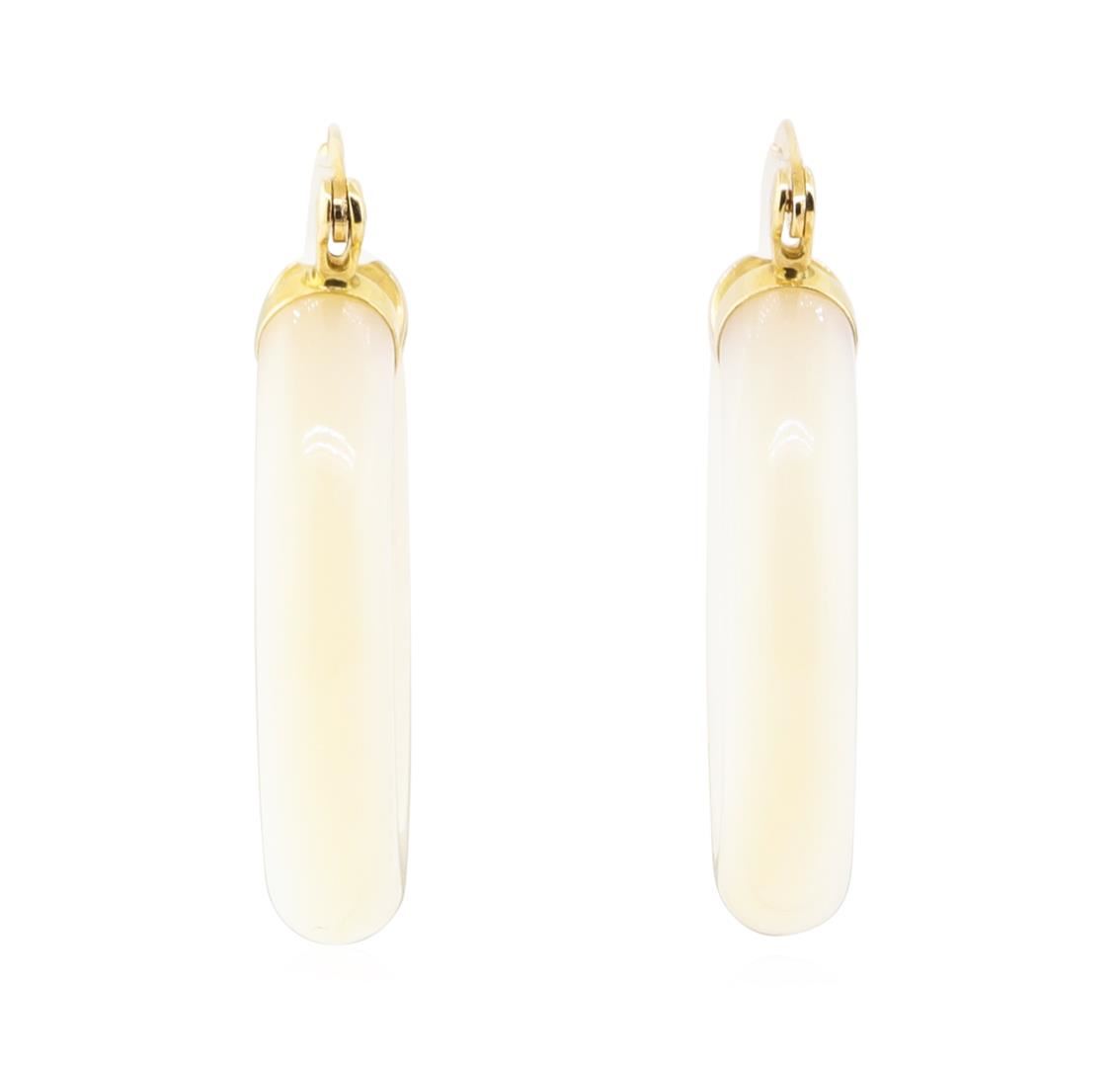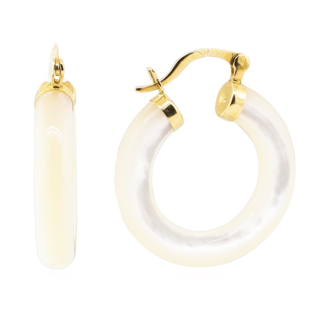 One pair of mother of pearl hoop earrings measuring 25 millimeters in diameter featuring: 14KT yellow gold weighing 6.3 grams.