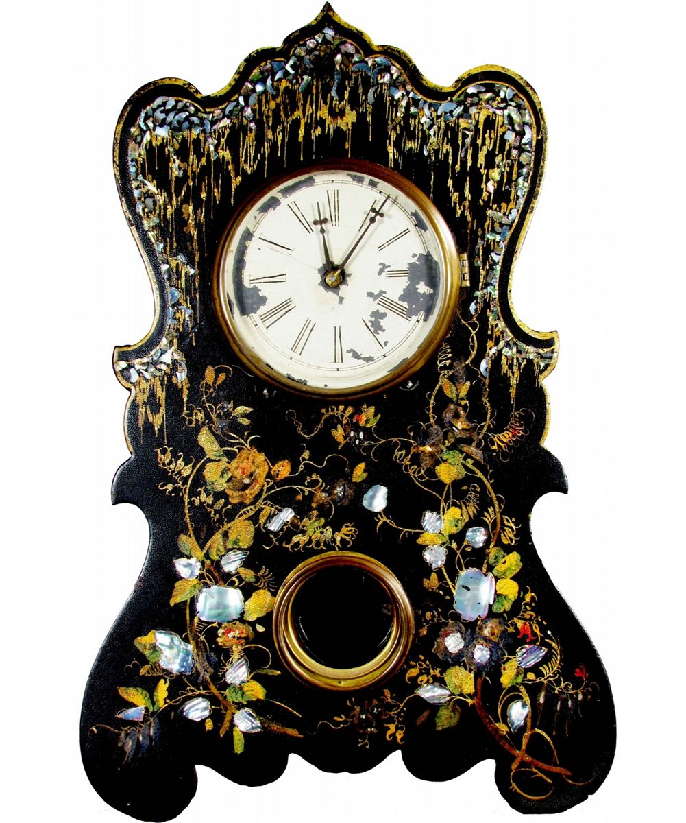 Painted Metal with Mother of Pearl Inlay Mantle Clock. T. S. Sperry Mfg. Co. Some paint loss to dial otherwise good working condition. 12 1/2 X 18 3/4 X 2 3/4 inches.