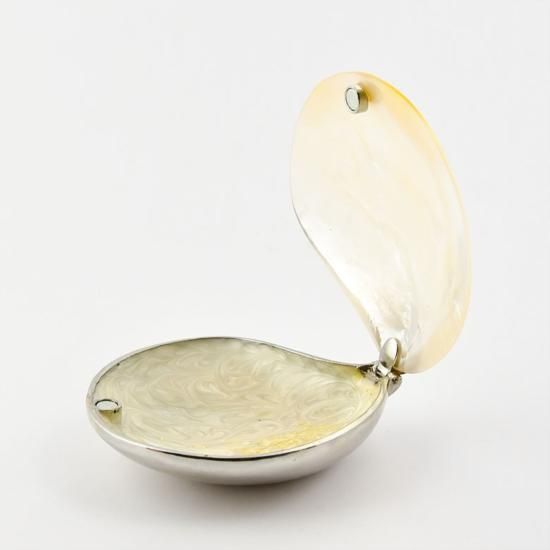 Mother of Pearl Jewelry Box . Mother of Pearl, or Nacre is an organic-inorganic composite material produced by some mollusks as an inner shell layer.It is also what makes up pearls. It is very strong, resilient, and iridescent. Nacre appears iridescent because the thickness of the aragonite platelets is close to the wavelength of visible light. This results in constructive and destructive interference of different wavelengths of light, resulting in different colours of light being reflected at different viewing angles. Dimensions: 3.5in (D) X 0.75in (H) The famed Faberge eggs are jeweled eggs, often with the most ornate, minuscule designs on them. The House of Faberge made the original pieces from 1885 to 1917. At that time, they became popular gifts given during the Easter season. Larger versions were made for the Russian royal family, including Alexander III and Nicolas II. Of these, 42 of the 50 originals exist today. Most Faberge eggs, though, were much smaller and hung from a chain around the neck. These eggs have precious metals on them or gemstone decorations, often with intricate detailing. These are a symbol of luxury and thought of as individual masterpieces.
