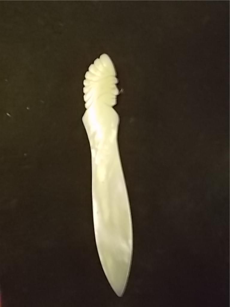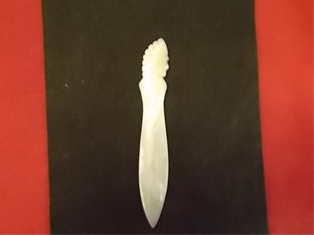 5” Antique Mother of Pearl Letter Opener Indian Chief Head. This 5” Mother of Pearl letter opener is very beautiful, probably a souvenir and is in used condition. From the collection of Good Time Charlie Cartwright, legendary tattoo artist famous for black and grey tattoo artistry. Charlie admired the American Indian and collected the image of American Indians and Western hero’s for 40 years. The collection has more ‘Indian Kitsch’ than ‘Route 66’ in the 1950’s. See Charlie in the soon to be released movie, ‘Tattoo Nation’. All measurements are approx.#19 tracking