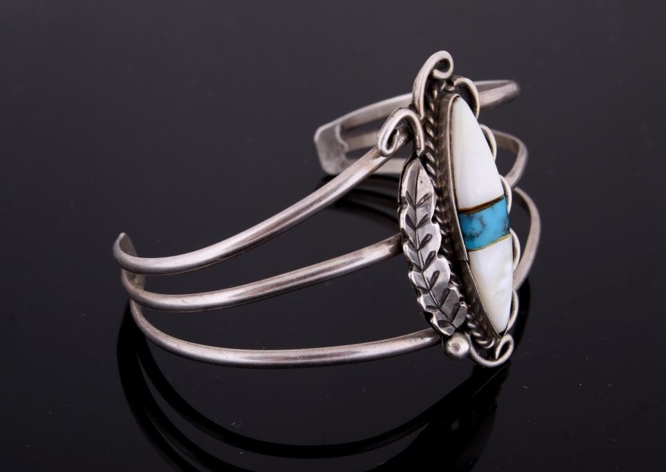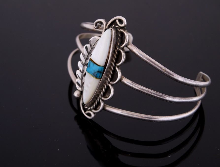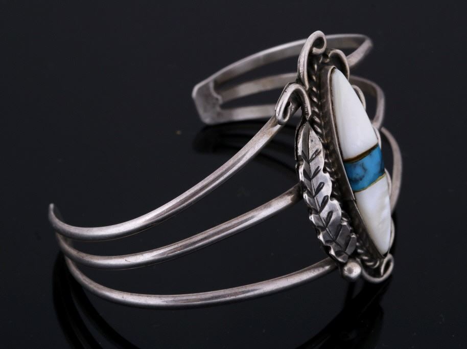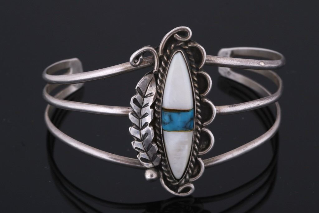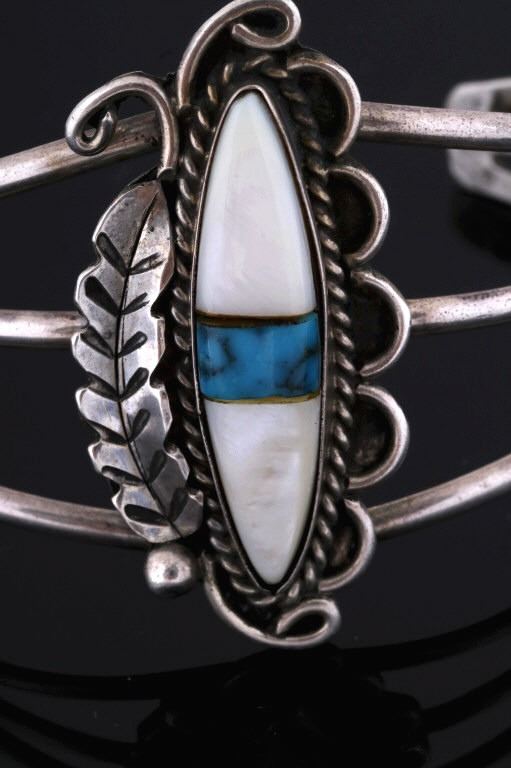For your consideration is this Mother of Pearl & Morenci Turquoise Silver Braclet. The condition of this armband excellent showing good construction with a three silver bar band that forks and is connected with a central silver plate with a silver feather and a length of silver twisted cord around the three stones in the plates center. This bracelet shows two triangular Mother of Pearl polished stones with a Morenci Turquoise stone in its center. The measurements of this armband is 2 1/2" x 2". The approximate measurements of the circumference of the bracelet is 4 1/2".