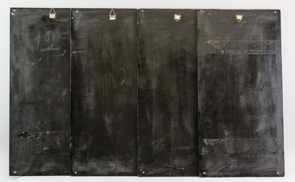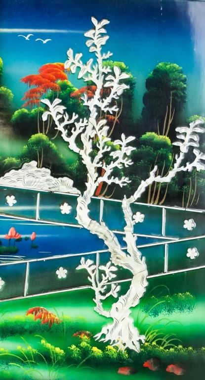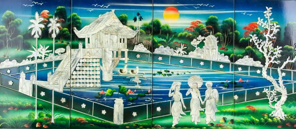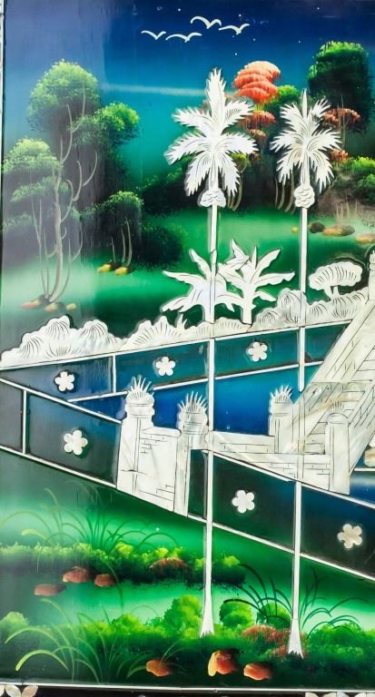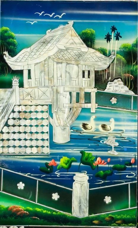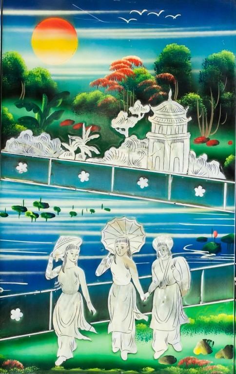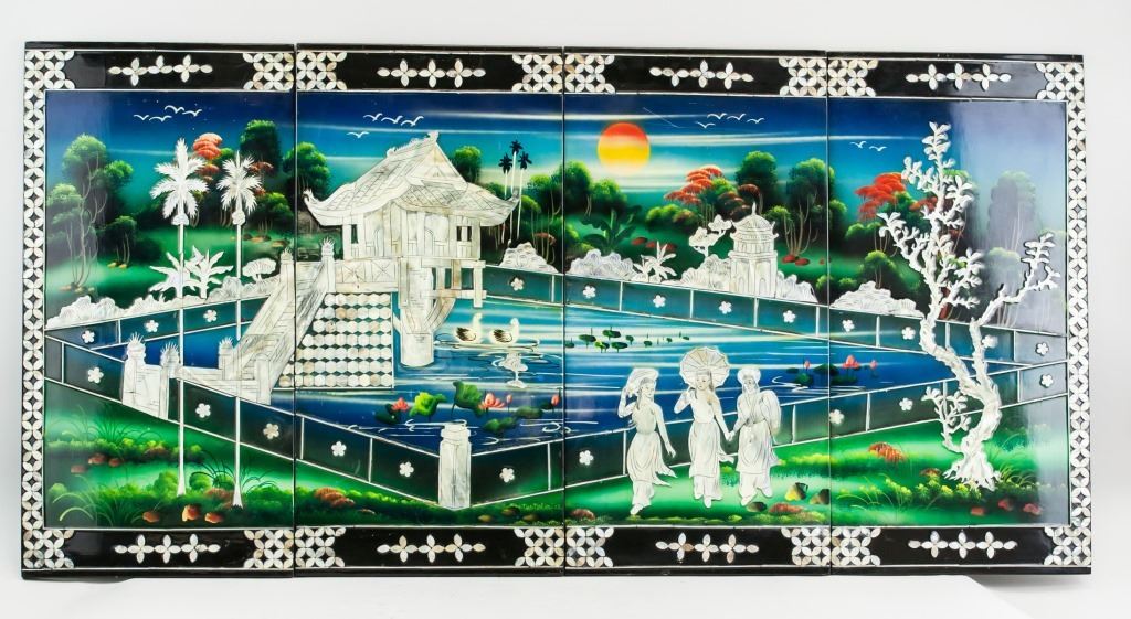 Mother of pearl panel. Featuring pavilion scene with three figures in the foreground. 50 x 30 cm (each panel). 1,391 grams (each panel).