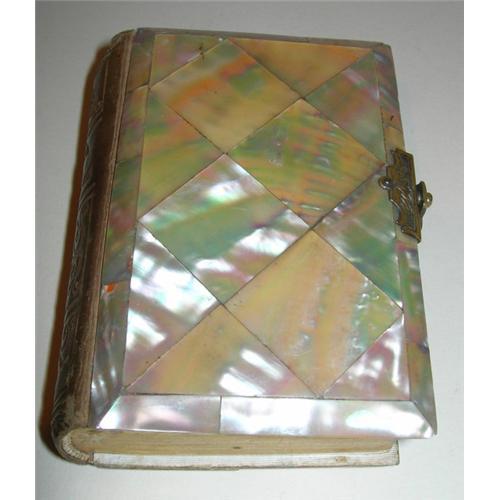 The spine is gold embossed, the back and front are mounted with Mother of Pearl panels and are kept tightly shut with the engraved brass clasp.