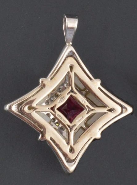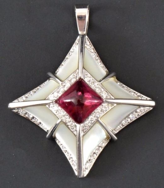 18k white gold.  With appraisal:   "One 18 kt white gold mother of pearl, pink tourmaline, and diamond pendant. The pendant contains one (1) square cabochon cut pink tourmaline measuring approximately 7.5 X 75 mm. The pendant also contains forty-eight (48) round brilliant cut diamonds with an estimated total weight of 0.50 ct. The diamonds have an approximate color of G-H and an approximate clarity of SI1-SI2. The pendant also has eight inlaid pieces of mother of pearl. The pendant weighs 13.5 grams. Approximate appraised value $1,750.00."