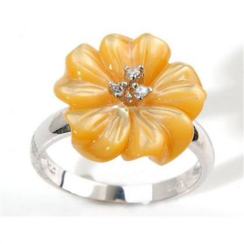 Size 7---Etched golden mother of pearl and diamonds form a flower and are set in this 14kt. white gold ring(15mm mother of pearl and 3 stones round, SI1-SI2 prong set diamonds).