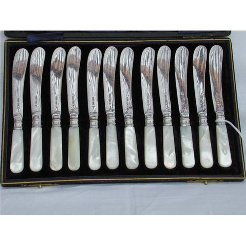 Twelve Piece set of mother of pearl butter knives including original velvet lined box.