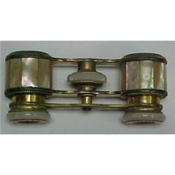 Mother of pearl opera glasses and two feather fans; opera glasses measure 3 1/2" x 1 1/2", stamped Pompadour across the front, lenses are marked Calmont Ft. Paris and Becker Washington, leather case; smaller fan approximately 7" comprised of ostrich feathers on wooden slats, one needs to be reattached; larger fan measures 8" and has fancy blue feathers on woden slats C.1900 Estimate 180/250
