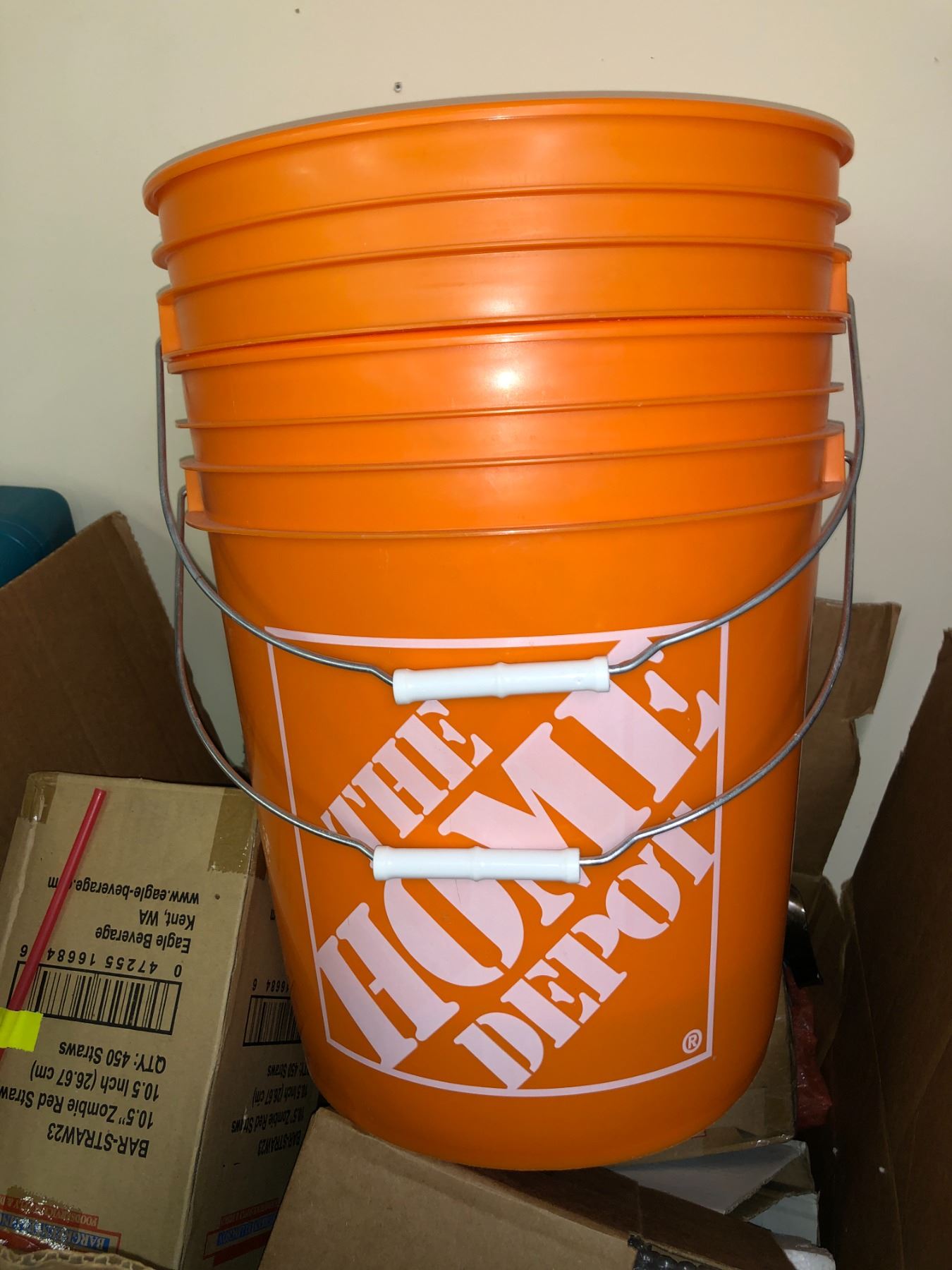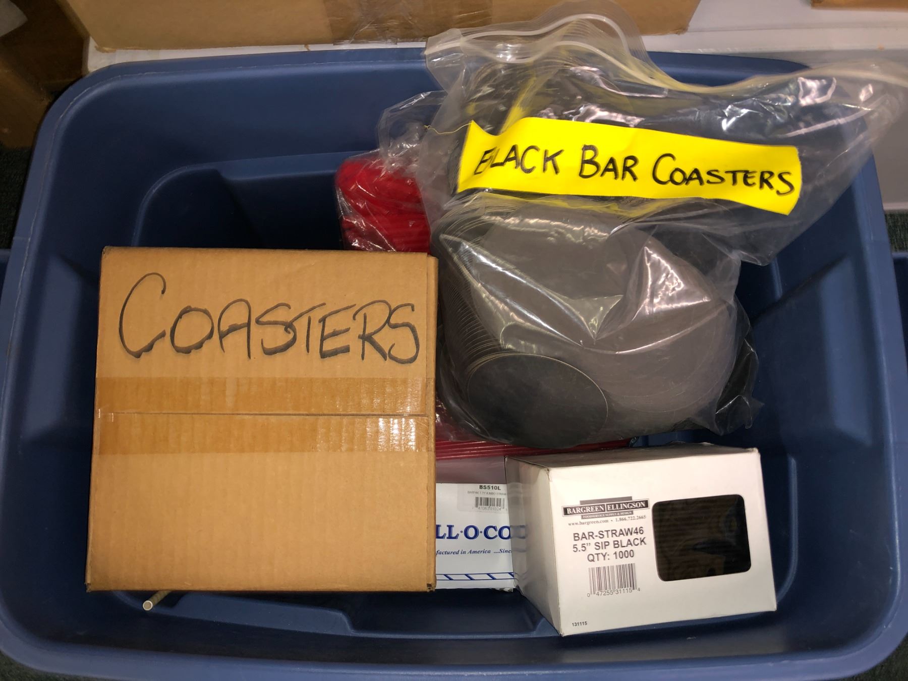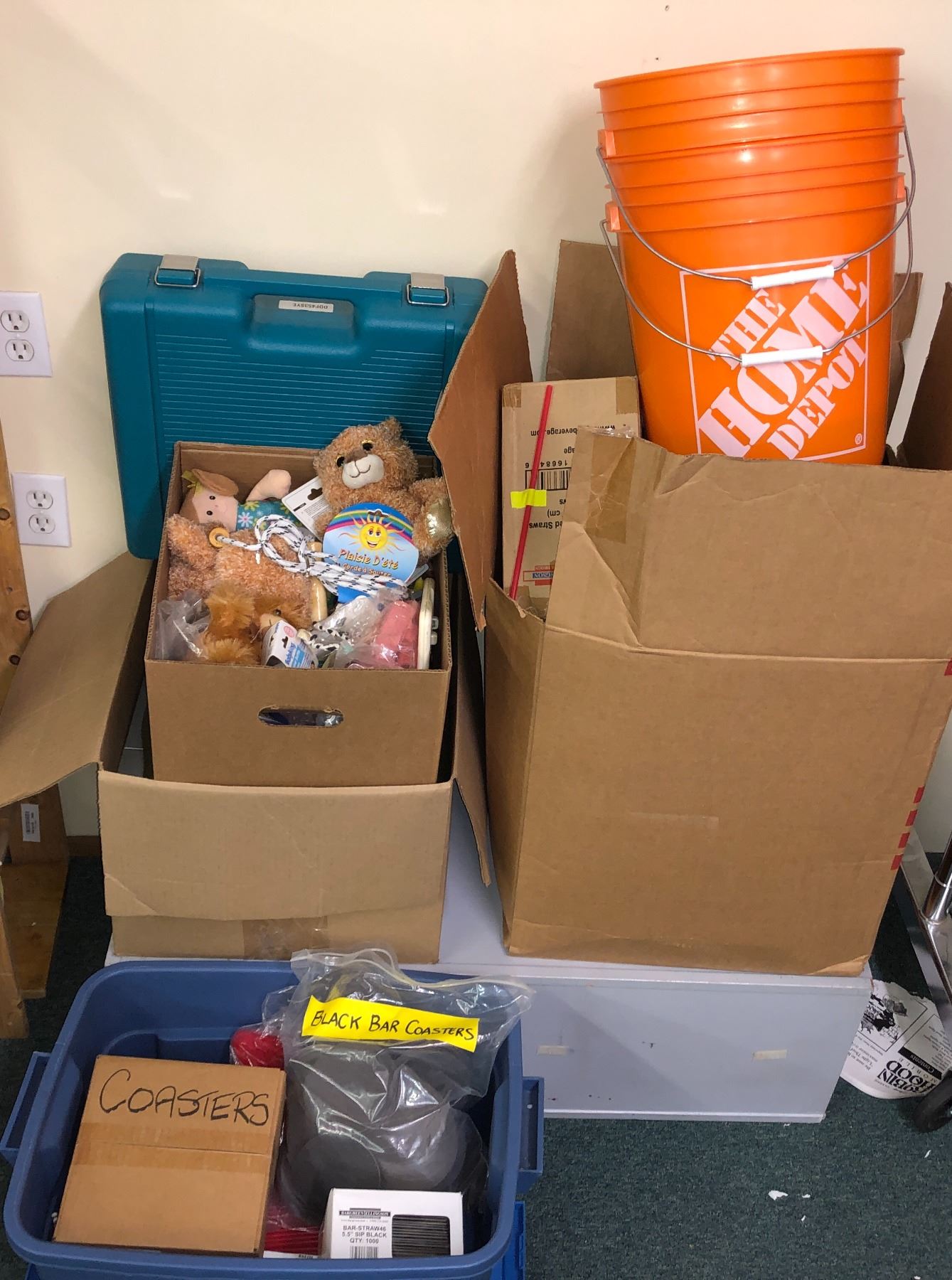 "Motherland: Fort Salem" - 4 Boxes of misc. items - includes straws/black bar coasters/home depot buckets/teddy bears/Mikita drill box etc.